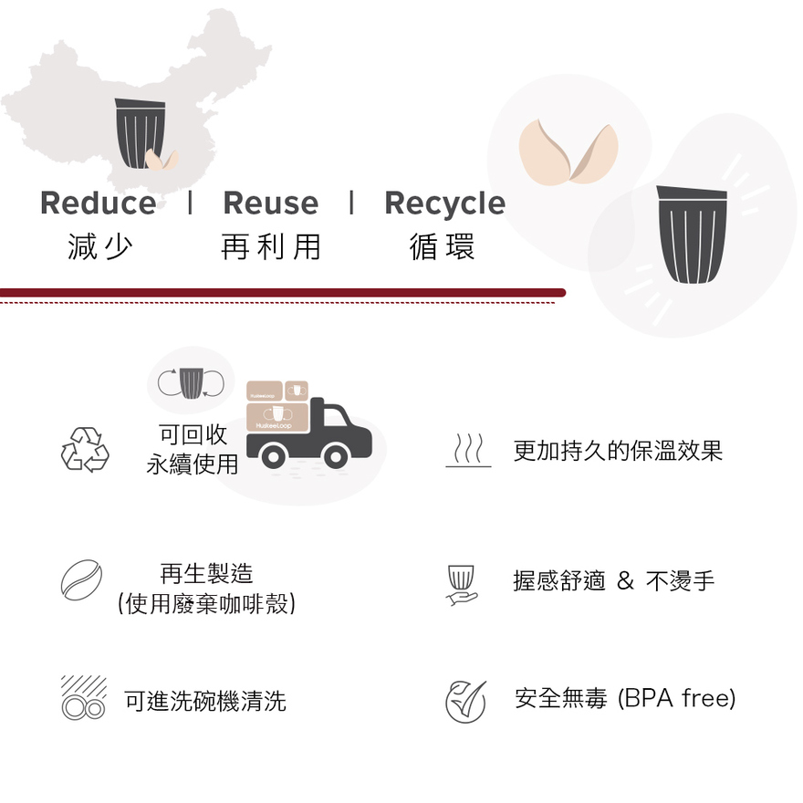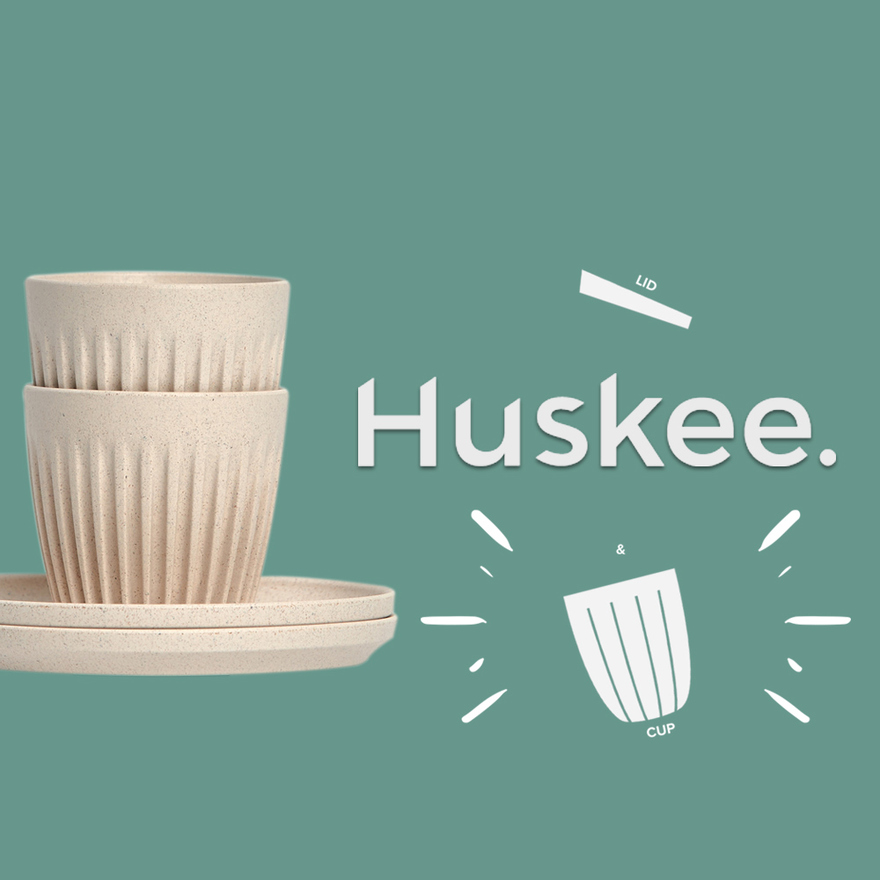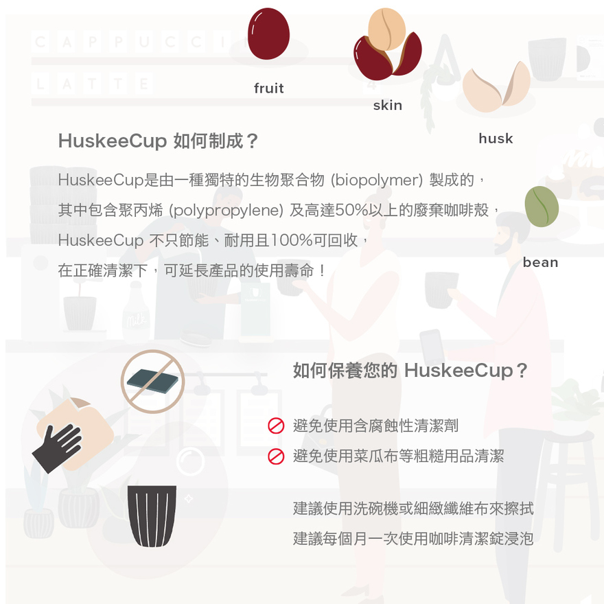 HuskeeCup是由一種獨特的生物聚合物(biopolymer)製成的其中包含聚丙烯(polypropylene)及高達50%上的廢棄咖啡。