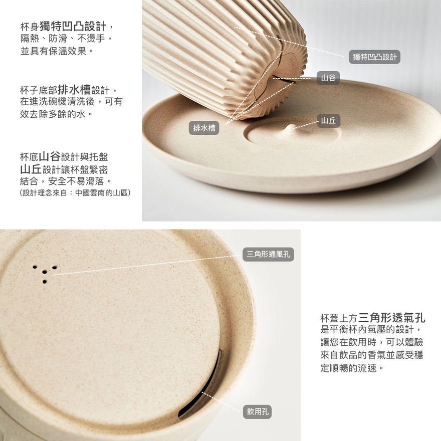 ✔️杯盤 50%上廢棄咖啡豆殼、生物聚合物(biopolymer)、聚丙烯(polypropylene)