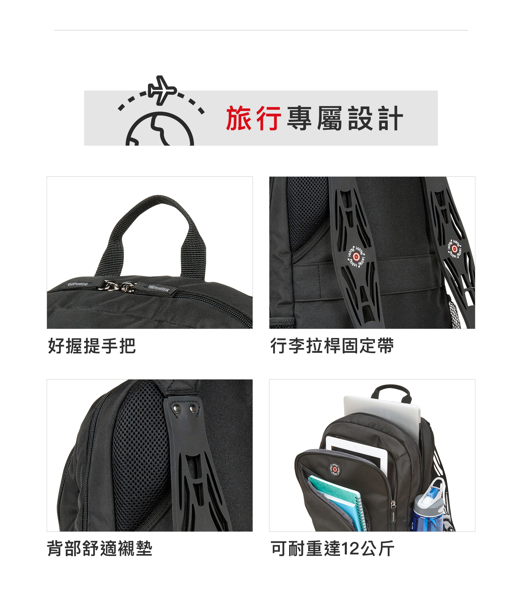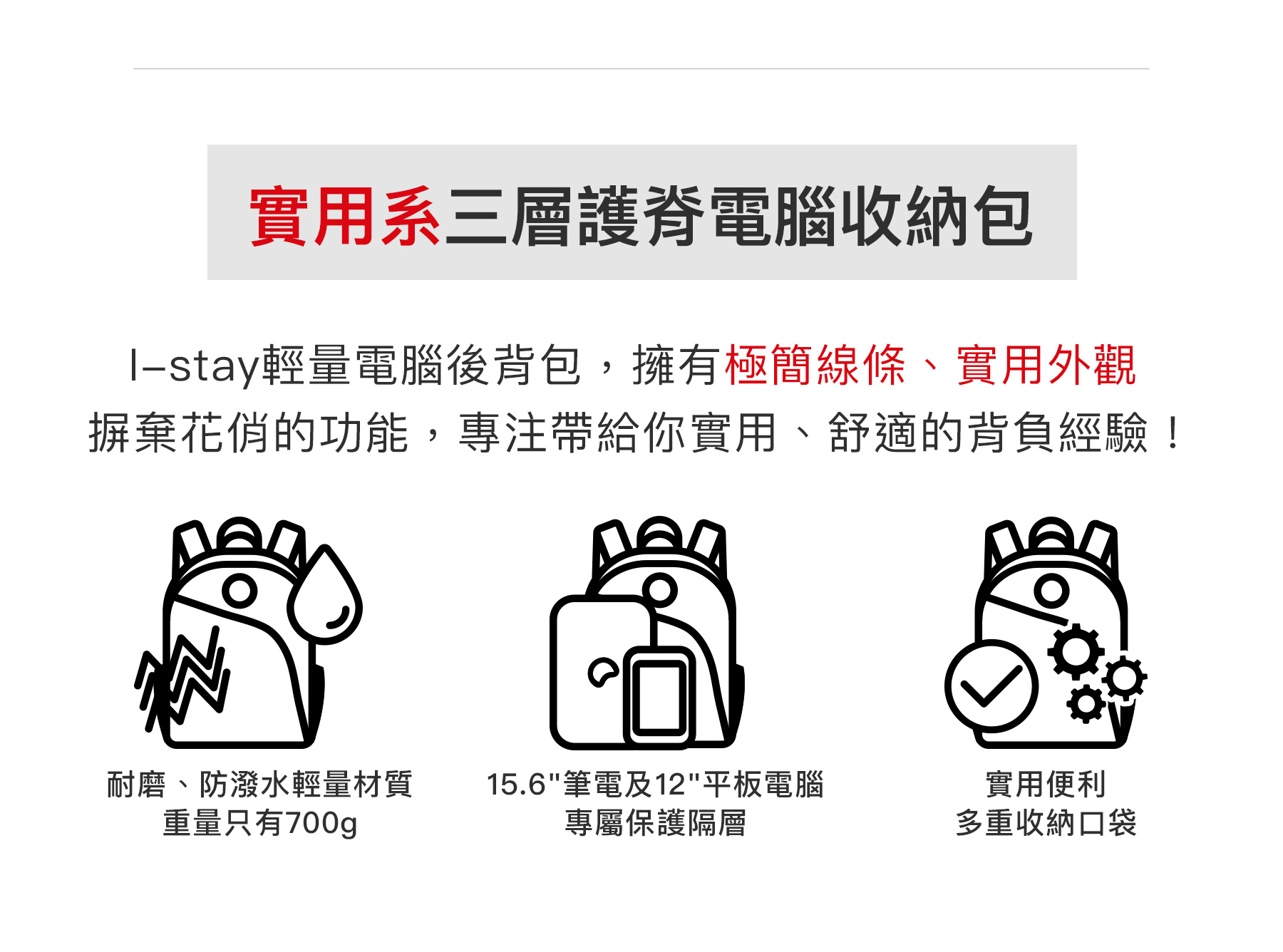 •實用系三層護脊電腦收納包•使用耐磨,防潑水輕量材質,重量只有700g!•15.6“筆電及12"平板電腦專屬保護隔層。•多重收納口袋,包含兩側網眼束口袋、前側側開拉鍊帶、中央文件隔層,以及電腦主袋!•i-stay入門款,雙肩配備「i-stay®止滑網格背帶」-英國皇家脊骨神經學院推薦 旅行專屬設計•好握雙提手把•行李拉桿固定帶 •背部舒適襯墊,促進空氣流通、減少悶熱出汗。•可耐重高達12公斤