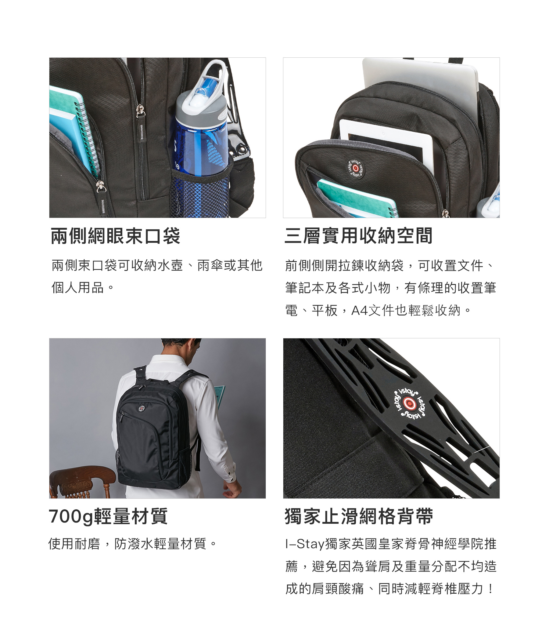 擁有極簡線條 實用外觀 摒棄花俏的功能,專注帶給你實用、舒適的背負經驗!三個主隔間口袋,有條理的收置筆電、平板,以及文件筆記,兩側束口袋可收納水壺、雨傘或其他個人用品,背面防盜口袋安全收納隨身小物、錢包及鑰匙。背包採用雙邊「i-stay®止滑網格背帶」,可將肩部重量分散且防止背帶滑動,即使在裝滿物品的型態下,背負者也感到輕盈不費力!適合經常旅行移動的創業人士,業務,辦公通勤族,以及經常需要攜帶文件書籍的學生、研究人員。**i-stay獨家止滑網格背帶-由英國皇家脊骨神經學院推薦,避免因為聳肩及重量分配不均造成的肩頸酸痛、同時減輕脊椎壓力!