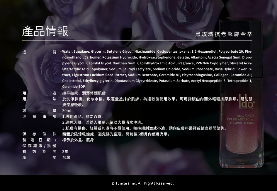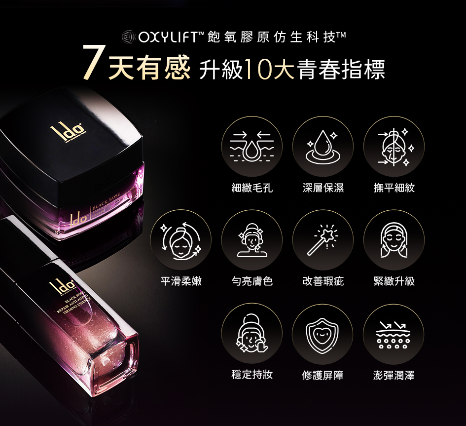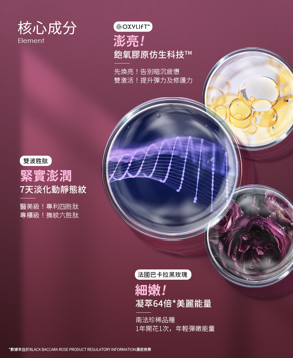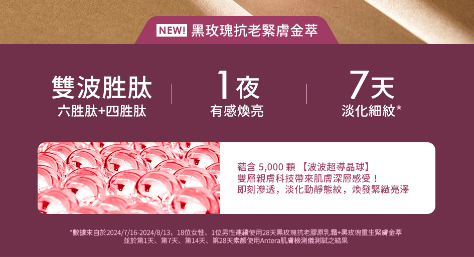 ※組合含黑玫瑰金萃30ml/盒*1★1緊 2繃,提亮緊實★熬夜撫紋神器!嫩亮有感、緊緻撫紋★蘊含5000顆波波超導晶球,雙層親膚科技直達肌底