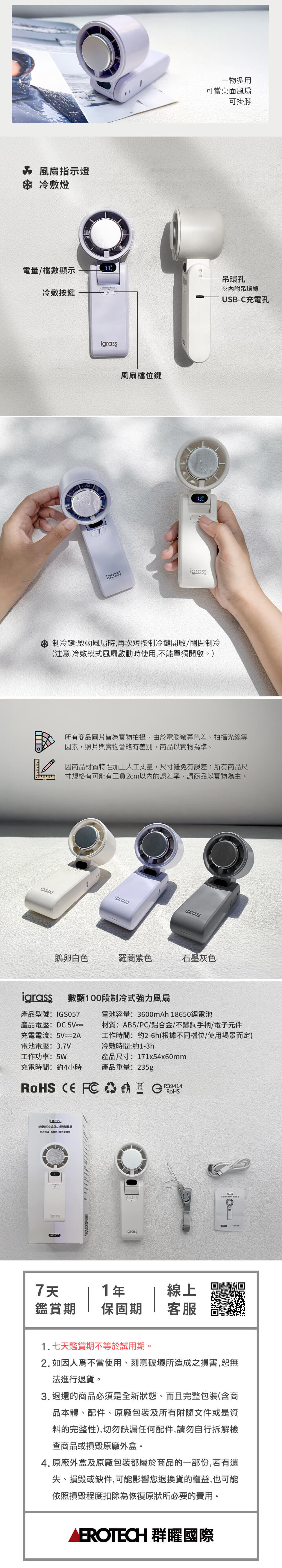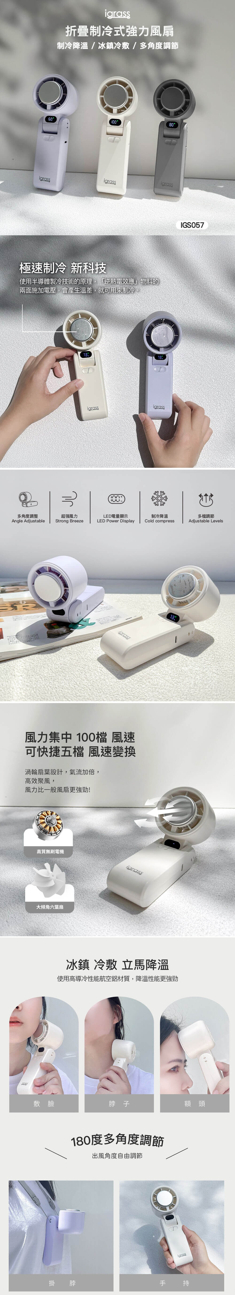 手持,掛脖,桌面平放 一機多用180度多角度調節風力集中 100段風速 隨心切換LED電量 風力顯示半導體製冷技術,冰鎮 冷敷 急速降溫3600mAh大容量鋰電池 使用時間最久達6小時通過BSMI認證
