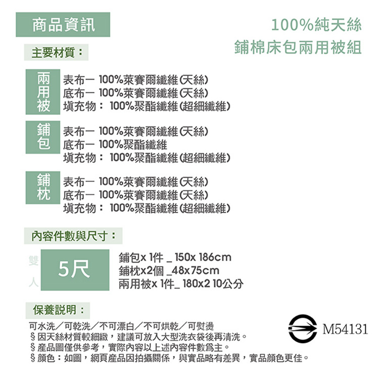 鋪包表布-100%萊賽爾纖維(天絲) 底布─100%萊賽爾纖維(天絲) 填充物─100%聚酯纖維(超細纖維)