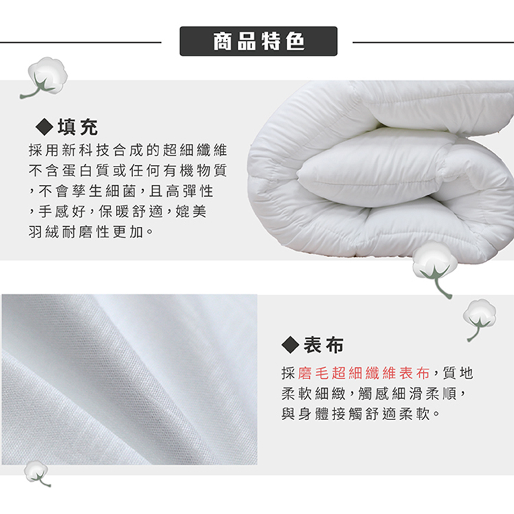 ★商品特色:*輕量:纖維柔軟纖細如天然羽絨*手感佳:具極佳的手感和保暖性,有蓄溫及阻絕冷空氣之功效*蓬鬆度佳:保暖性和蓬鬆性媲美天然羽絨,車格超膨鬆,牢牢固定填充物,舒服又溫暖*不生菌:聚酯纖維本身有不易生蹣的優勢,是理想的填充物之一*枕頭表布採超細纖維布,觸感細密柔滑舒適,與身體柔順接觸無粗硬感品質精緻,透氣纖維材質,清爽舒適,採蓬鬆超細彈性纖維,熱銷NO.1