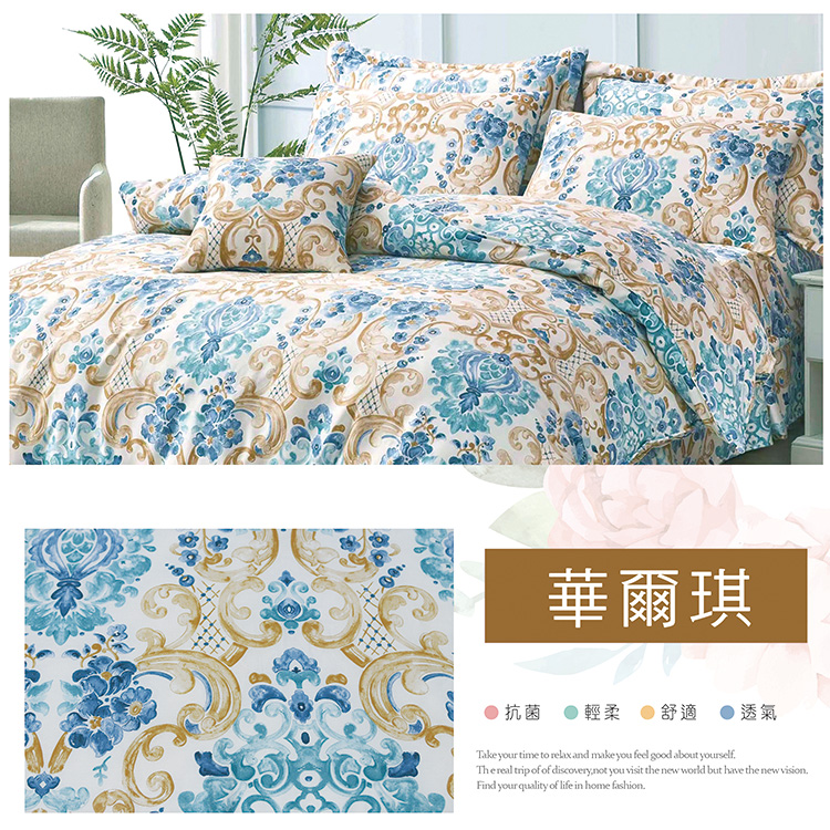 鋪棉兩用被套*1件-6x7尺(182x212cm)床罩*1件-5x6.2尺(152x188cm)枕套*4個 -48x75cm靠墊*1個7件/組
