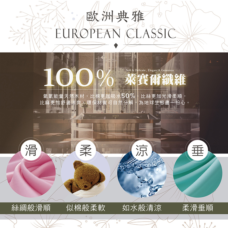★材質:兩用被表布-100%萊賽爾纖維(天絲)底布─100%萊賽爾纖維(天絲)填充物─100%聚酯纖維(超細纖維)