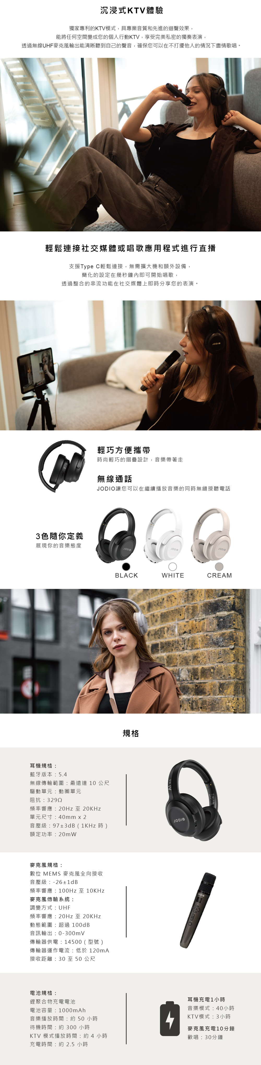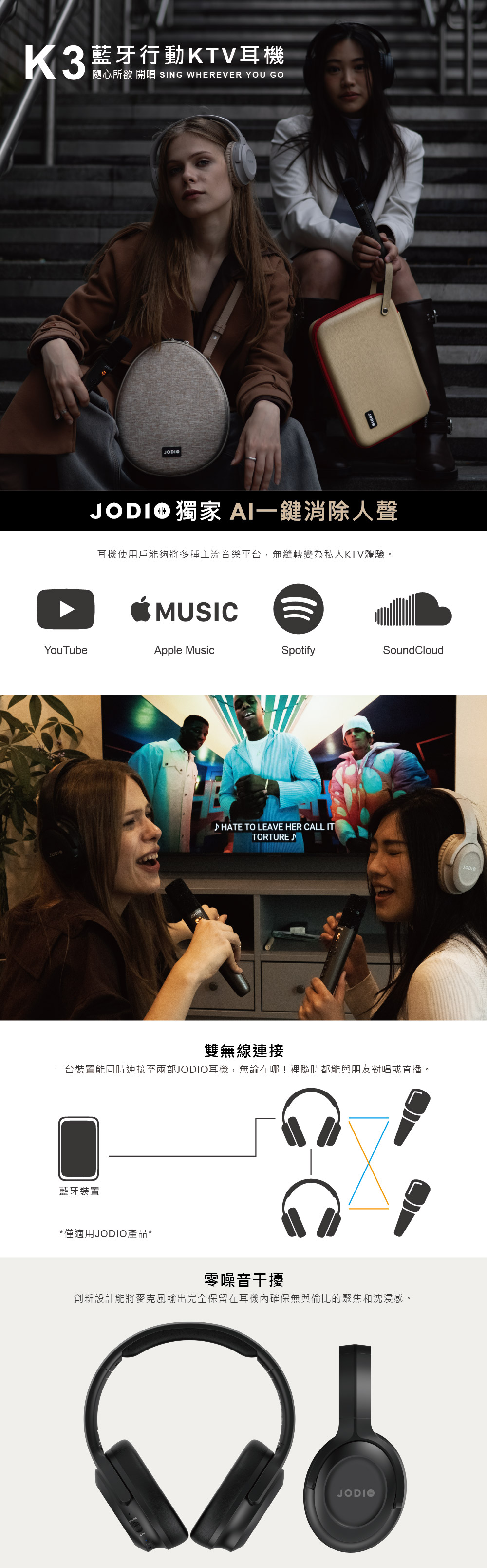 • 全球首創AI一鍵消除人聲,免下載APP• 革命性零噪音干擾,能清楚聽到自己的聲音• 雙無線連接,可同步連接2組耳機,輕鬆雙人對唱• JODIO獨家沉浸式KTV模式,帶來身歷其境的歡唱體驗• 可自由升降Key,找到最適合自己的音域• 輕巧機身設計,隨身攜帶更方便• 支援Type-C與3.5mm音源輸出,多裝置通用(外接喇叭、音箱
