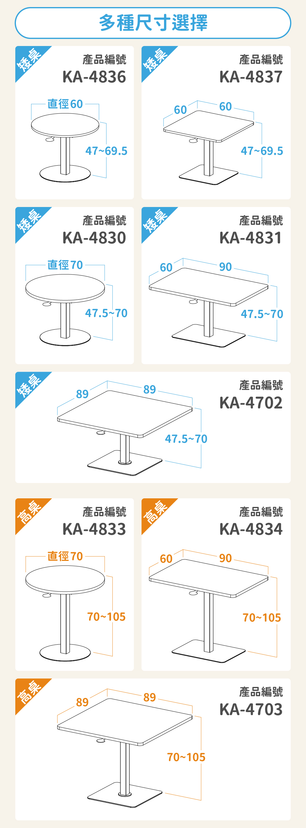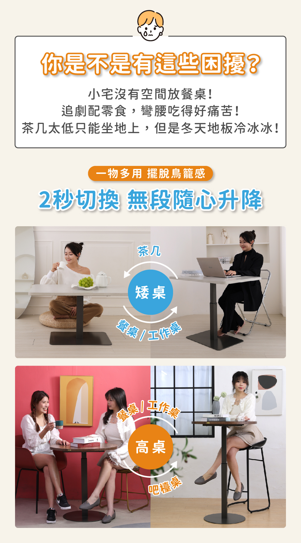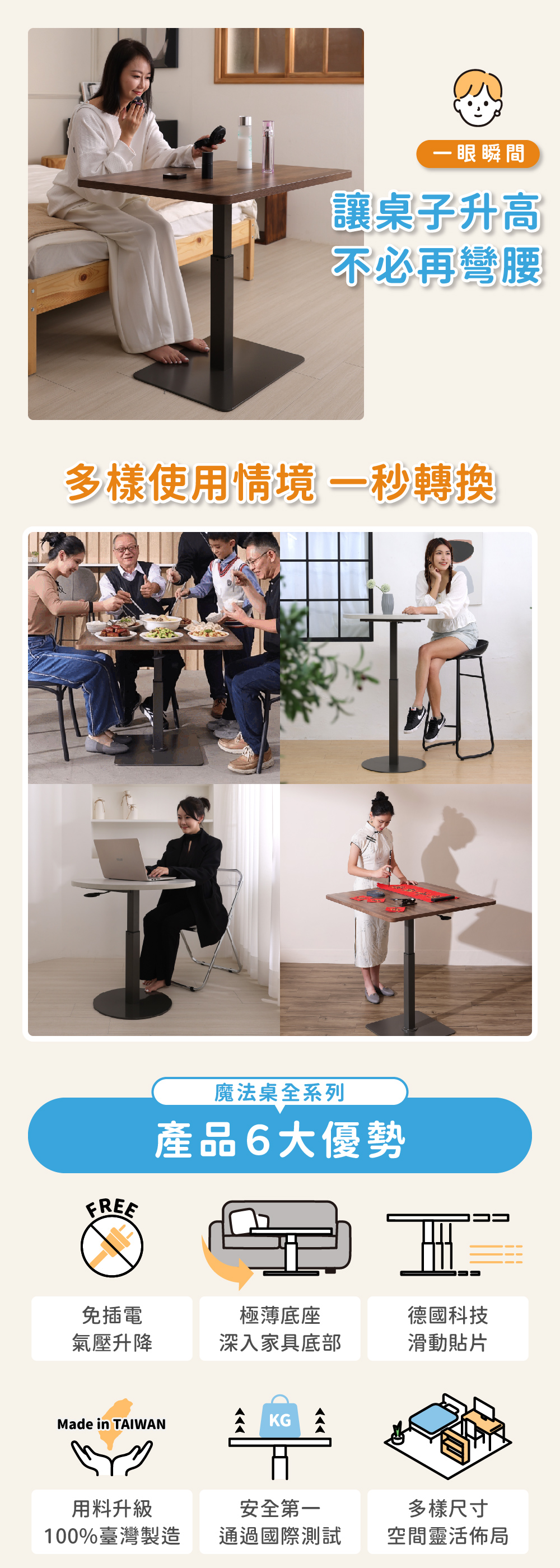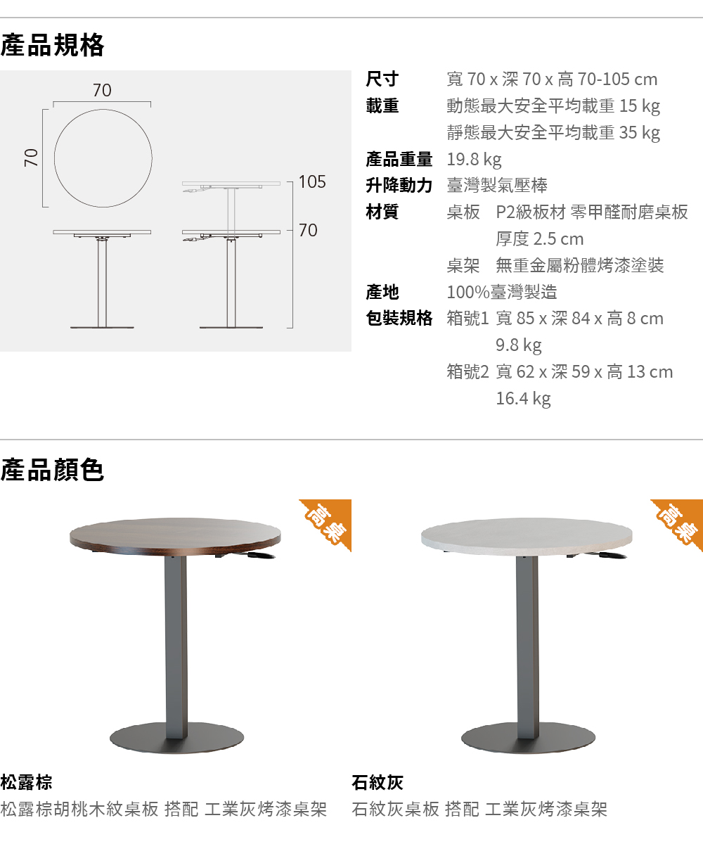 尺寸 寬 70 x 深 70 x 高 70-105 cm載重 動態最大安全平均載重 15 kg 靜態最大安全平均載重 35 kg產品重量 19.8 kg升降動力 臺灣製氣壓棒材質 桌板 P2級板材 零甲醛耐磨美耐皿板 厚度 2.5 cm 桌架 無重金屬粉體烤漆塗裝產地 100%臺灣製造包裝規格 箱號1 寬 85 x 深 84 x 高 8 cm / 9.8 kg 箱號2 寬 75 x 深 57 x 高 13 cm / 16.4 kg