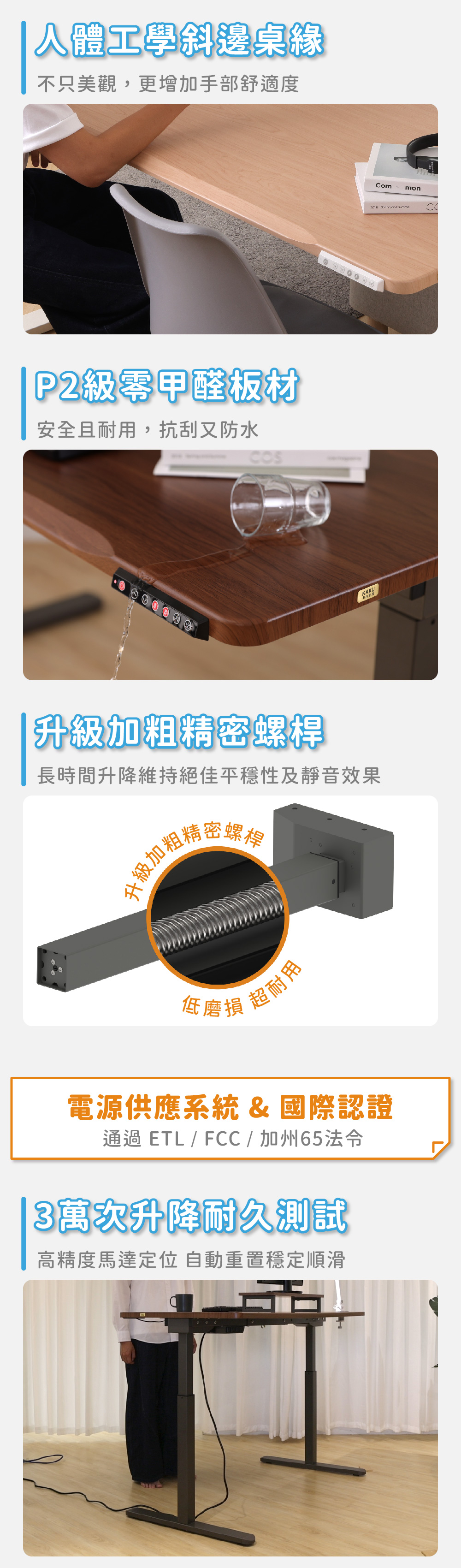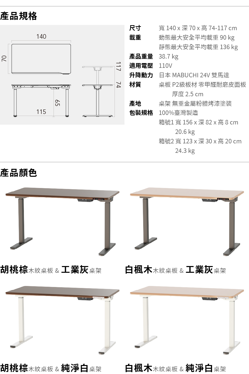 尺寸 寬 140 x 深 70 x 高 74-117 cm載重 動態最大安全平均載重 90 kg 靜態最大安全平均載重 136 kg產品重量 38.7 kg適用電壓 110V升降動力 日本 MABUCHI 24V 雙馬達材質 桌板 P2級板材 零甲醛耐磨皮面板 厚度 2.5 cm 桌架 無重金屬粉體烤漆塗裝產地 100%臺灣製造包裝規格 箱號1 寬 156 x 深 82 x 高 8 cm / 20.6 kg 箱號2 寬 123 x 深 30 x 高 20 cm / 24.3 kg