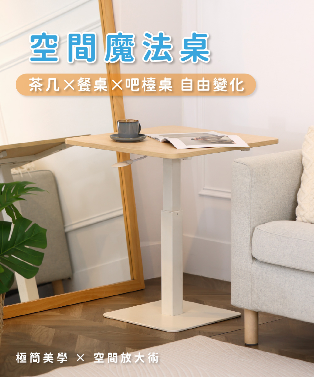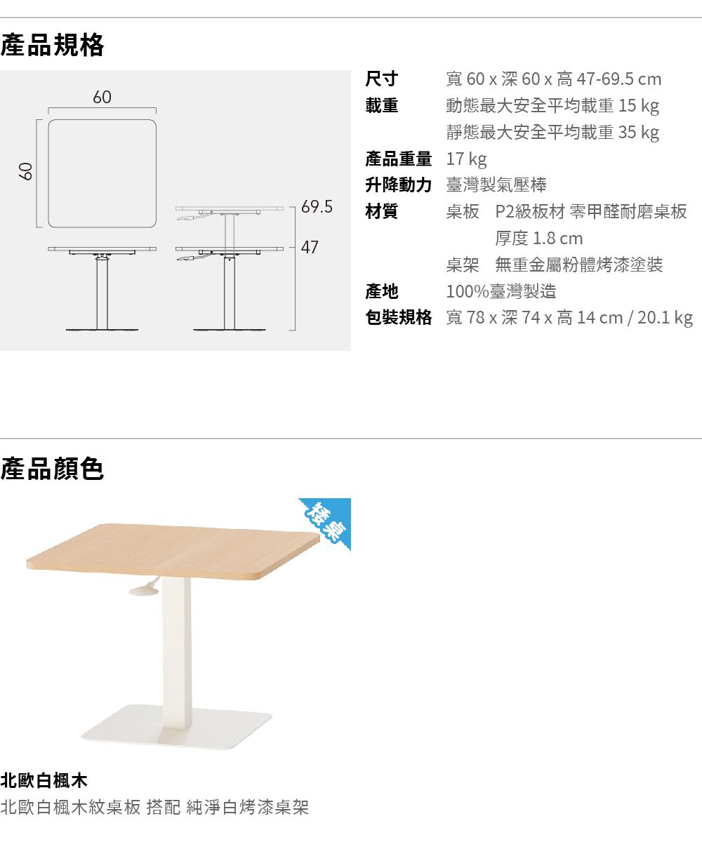 尺寸 寬 60 x 深 60 x 高 47-69.5 cm載重 動態最大安全平均載重 15 kg 靜態最大安全平均載重 35 kg產品重量 17 kg升降動力 臺灣製氣壓棒材質 桌板 P2級板材 零甲醛耐磨美耐皿板 厚度 1.8 cm 桌架 無重金屬粉體烤漆塗裝產地 100%臺灣製造包裝規格 寬 78 x 深 74 x 高 14 cm / 20.1 kg