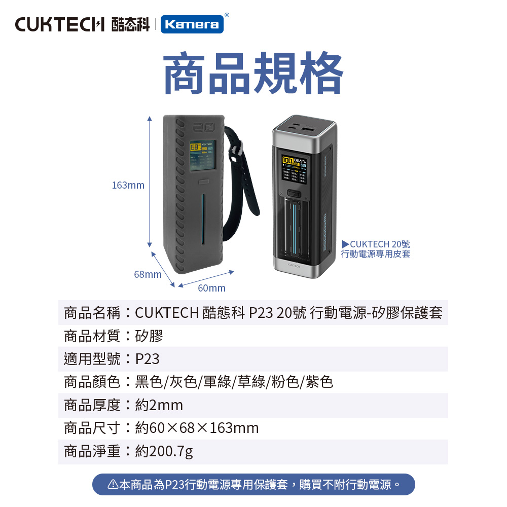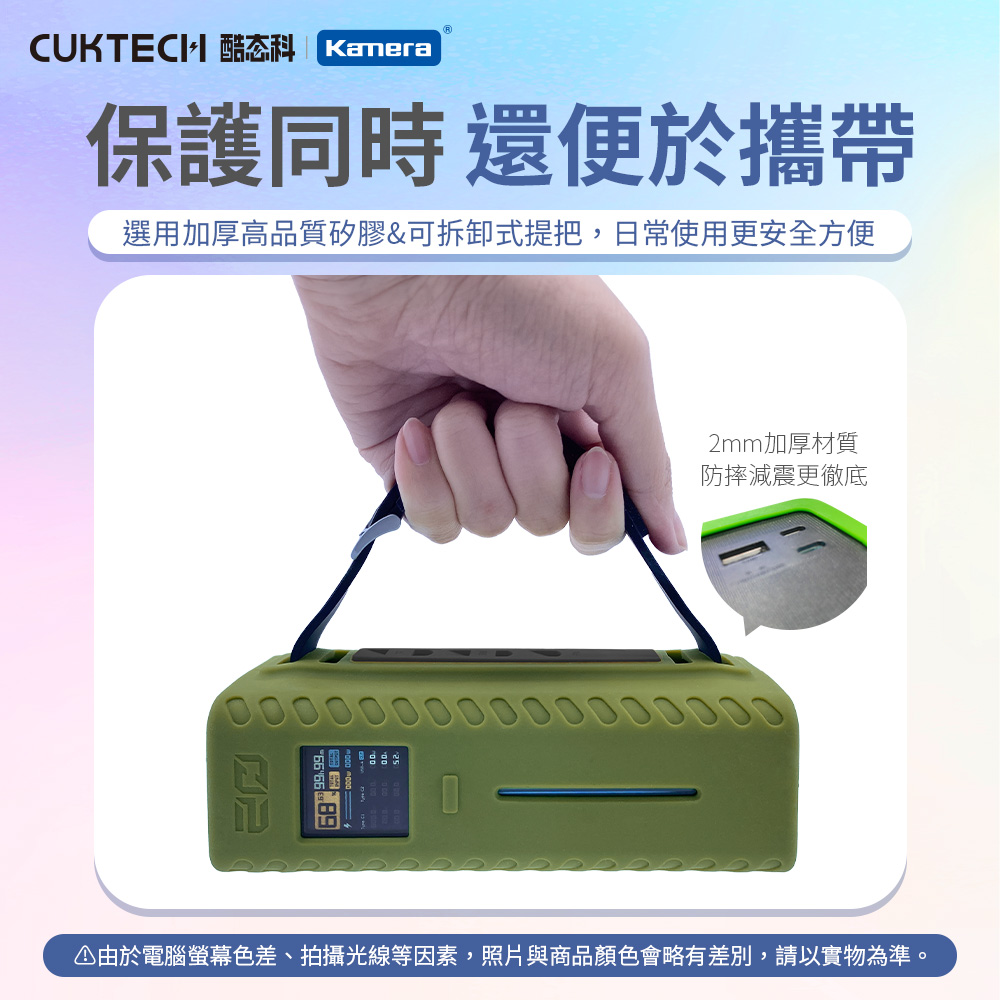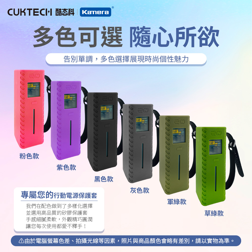 產品特點● 20號行動電源專用,1:1完美貼合設計,巧妙展現,不遮按鍵及螢幕!機場安檢也無須拆卸保護套。● 高質感加厚2mm矽膠,防刮耐磨,完美保護您的行動電源。● 保護同時便於攜帶,可拆卸式2cm寬提帶,可調整鬆緊或拆卸使用,讓您更方便好拿。● 每個細節都講究到位,側邊特殊設計,可收納線材、SIM卡、記憶卡、PIN等…。● 背面可收納充電線材,讓出門行囊不凌亂,是您的旅行好夥伴。● 多色可選,告別單調配色,展現時尚性格魅力,外觀精巧圓潤,每次使用都愛不釋手。● 附防塵塞設計,完美保護行動電源充電孔。