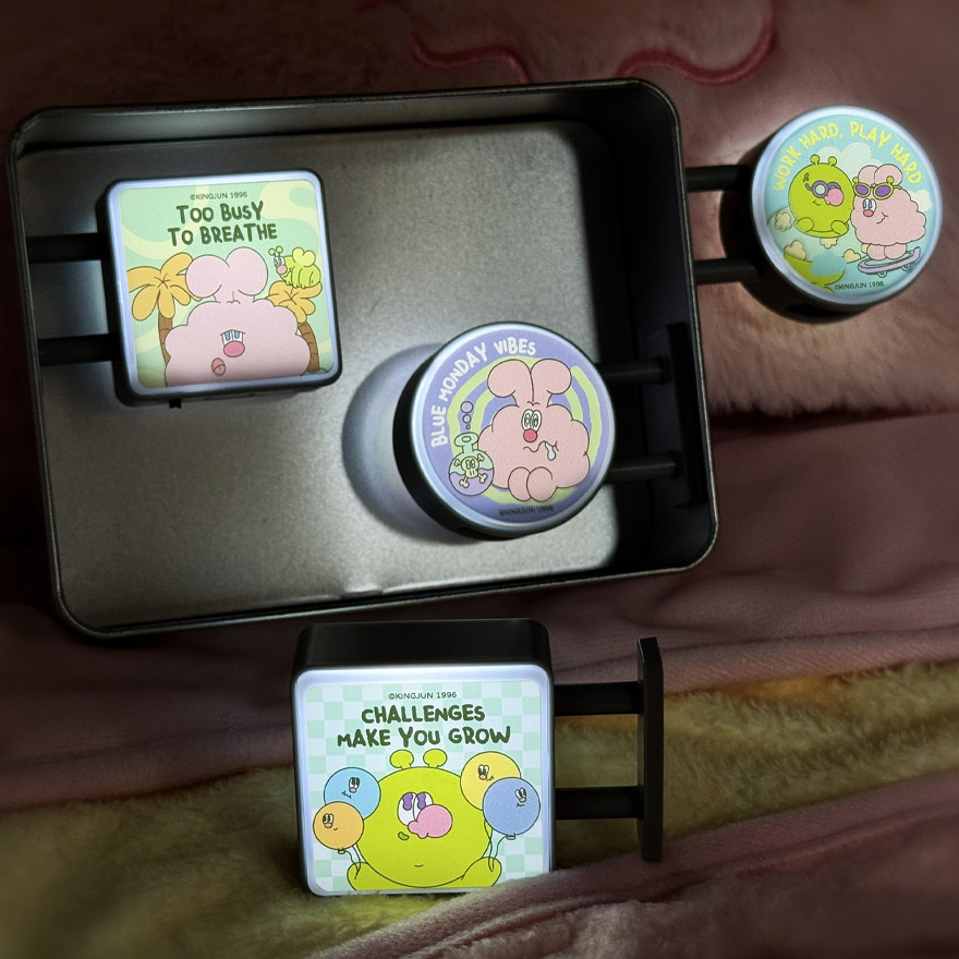 *顏色因電腦螢幕解析度的不同,會與實體商品顏色稍有落差,請以實體商品顏色為主*要求完美者請勿下單*包裝盒未提供保固及退換貨服務歡樂繽紛KINGJUN磁吸小燈牌亮麗造型一次推出4款,款款必集活力語錄加上KINGJUN繽紛鮮明超Q圖像表情超療癒可吸附桌邊.冰箱磁性面板或是平擺置放是生活中必收療癒小物,就是生活中那個歡樂的光!!!尺寸:約5.5*2*4cm材質:ABS塑膠.LED燈.磁鐵