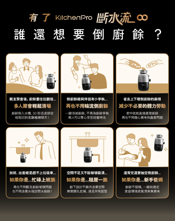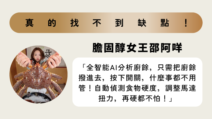※注意:1.房子若非新建案,屋齡約3年以上或排水較不通順之流理臺建議先請通排水人員處理後安裝較為理想。2.安裝後發現排水不順者也建議進行通排水。⭐⭐⭐⭐⭐ 強力推薦 斷水流廚餘機 ⭐⭐⭐⭐⭐屈中恆:大師兄回來了!馬力歐:廚餘別再冰冰箱啦!貝童彤:太扯了太扯了!蘿莉塔:丟廚餘不要在停留在上個時代了!邵阿咩:大胃王海陸大餐速度對決!彥窩:「豬大骨30秒打成汁!」阿康:只要一鍵,就可以輕鬆解決廚餘!*36個月安心保固*信用卡3期/6期0利率*限時優惠免安裝費------------------------------------------------------------【產品規格】● 產品尺寸:W222 xD198 xH355(mm)● 產品淨重:6.7Kg● 腔體容積:1,400ml● 適用電壓:AC110V 50-60Hz● 接口尺寸:外徑110mm (內徑 90mm)● 使用功率:750W● 空載噪音:<55分貝<br>● 額定轉速:3,000 rpm● 研磨技術:雙向提升研磨+遇阻反轉● 馬達技術:直流無刷變頻馬達● 啟動開關:無線觸控開關/螢幕觸控/機械開關● 自動進水:有----------------------------------------------------------------傳統廚餘處理的痛點,你中了幾個?🔸 追垃圾車:每日等待,費時又麻煩。🔸 存放冰箱:佔空間,異味難聞。🔸 直接丟垃圾桶:容易滋生蚊蟲與異味。🔸 傳統廚餘機:雖能粉碎,但仍需手動處理殘渣。AI 智能四步驟,一鍵消滅廚餘Step1. 啟動粉碎:無線藍牙控制開關,免鑽牆、免拉線,靈活安裝。Step2. 倒入廚餘:多功能安全塞,輕鬆放入廚餘。Step3. 研磨成汁:AI 自動注水,智慧偵測廚餘量,精準供水,提高研磨效率。Step4. 強力排出:TurboMax 60,000Pa 渦輪水壓,沖走所有殘渣,保持水管暢通。強勁動力,無懼挑戰🔹 德國變頻無刷馬達:高速運轉,自動偵測硬度,智慧調整扭力。🔹 8 道研磨工序:渦流進水 → 高速研磨 → 捶擊粉碎 → 交錯切割 → 變頻扭力 → 分層過濾 → 離心迴旋 → 強壓排水。🔹 零晃動降噪設計:精密平衡研磨盤,減震降噪 <50dB,安靜運作不擾人。<br>🔹 智慧防卡功能:每次開機自動反轉,防止卡頓,自動拋除異物,確保順暢運行。強力水流,確保水管暢通🔹TurboMax 60,000Pa 強壓渦輪排水:不僅是廚餘機,更是水管守護者!🔹 6 公尺高強力水柱:可沖至 3 樓高,徹底沖走油污與細小顆粒。🔹20 段智慧防堵系統:偵測水流狀況,自動加壓排水,避免水管堵塞。貼心安全設計🔸 8 重安全防護:✔ 多功能安全塞 ✔ 兒童安全鎖 ✔ 專屬安全插梢 ✔ 阻燃材質✔ 無刀刃設計 ✔ 過載保護 ✔ 過熱保護 ✔ 智慧自動關機🔸 LED 高清觸控面板:即時顯示運行狀況,廚房環境一目了然。----------------------------------------------------------------▲以上均含安裝◆安裝須知服務規範說明:下單前請先預安裝之現場符合以下條件1.有足夠空間擺放機器(如已達現場因尺寸不合無法安裝則需酌收工本費)2.有自來水源3.有110V電源及排水孔,(220V需事先告知)。4.如需鑽孔,請先聊聊告知小編(木質檯面.不鏽鋼水槽.石材檯面.其他檯面) 。5.含配送安裝費用請先告知地區、樓層、有無舊機回收(偏遠地區請先聊聊)。6.外島恕不安裝。7.下單後留下姓名電話,3天內即有專人與您聯繫安排安裝時間(例假日除外) 。8.安裝時間依照技工評估現場狀況,安裝位置需距離水源3公尺內,超過此標準距離需酌收管線費用。9.技師安裝拆箱時請確認產品是否完整◆鑑賞期 特別注意事項◎鑑賞期非適用期或使用期,商品經安裝或使用後,僅供保固服務 ◎消費者享有鑑賞期的權益。但鑑賞期並非試用期,您所退回的商品必須是全新的狀態且完整包裝;請注意保持商品本體、配件、贈品、保證書、原廠包裝所有附隨文件或資料以及原廠外盒的完整性。為了維護您的權益,下標前請記得先聊聊詢問產品庫存及商品資訊,確定後再下單,如經拆封或使用,將影響您的退貨權益。