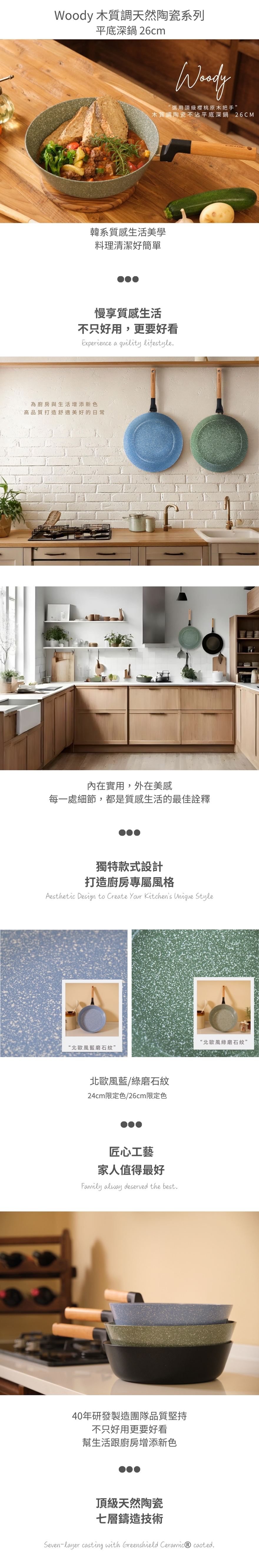 ●韓國研發GreenShield ceramic天然陶瓷不沾塗層,無PFOA、PTFE,更健康更耐用 ●通過SGS 436項檢驗認證不含PFAS,不只好用更安心 ●高效導熱蓄熱、木質防焰把手設計 ●一秒擺拍輕鬆上桌,幫廚房增添新色 ●適用IH爐、瓦斯爐、電磁爐、黑晶爐等各種爐具,翻炒料理通通一鍋搞定 ●鍋內外均為天然陶瓷塗層,料理、清潔都簡單! ●慢享質感生活原味,用儀式感調味幫生活加一點美好