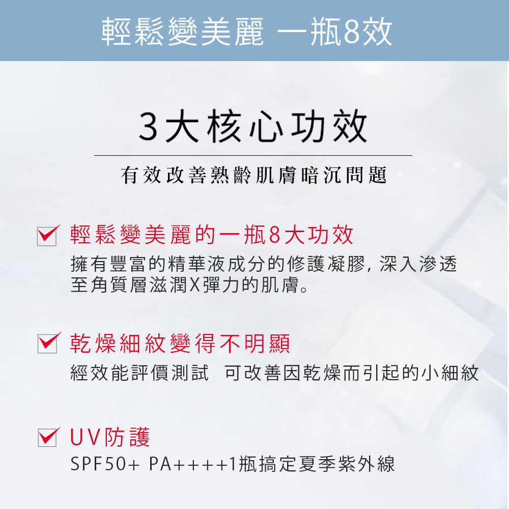 【用途】 深層滋潤並提升彈力,改善乾燥細紋,使肌膚更緊緻柔嫩