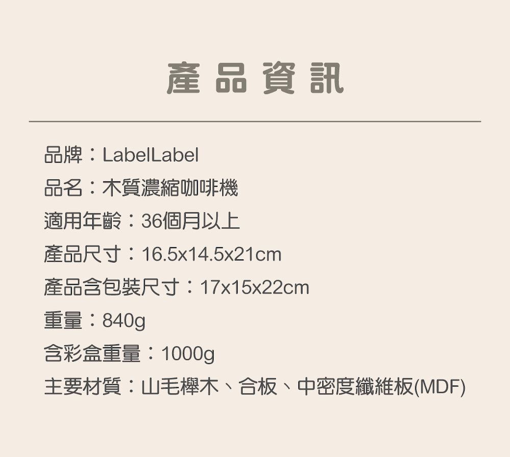 尺寸:16.5x14.5x21cm重量:840g材質:山毛櫸木、合板、中密度纖維板(MDF)產地:中國●坐下來好好享受,用濃縮咖啡機製作的美味咖啡●濃縮咖啡機配有 2 個杯子、2個湯匙、一個鮮奶杯和 3 款咖啡豆●將咖啡機轉動開關後,再選擇沖調的杯數●把咖啡豆放入沖煮手把內,沖一杯美味的濃縮咖啡●沖煮好的咖啡,再用蒸氣管打出綿密的奶泡●採用FSC™認證木質製成,外觀顏色,使用兒童友善的水性顏料●學習主題:眼部協調/手部小肌肉/形狀/角色扮演