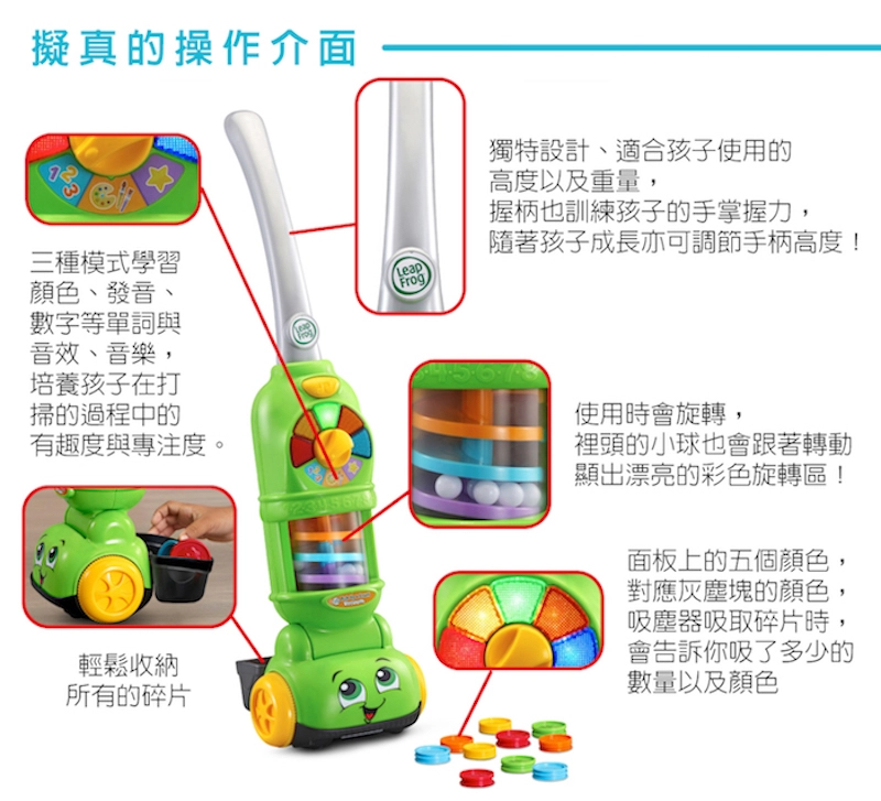 *擬真的吸塵器操作,讓孩子更融入模擬情境*內含五種顏色共十個碎片配件*透過遊戲,了解吸地打掃過程 *多元學習主題-顏色/數字/排序/配對*培養孩子記憶力、想像力、人際關係及情緒表達*碎片可存放在附帶的垃圾桶中,並在遊戲結束後輕鬆收取*手柄傾斜度有兩段式可調節,以實現“成長”的樂趣和學習