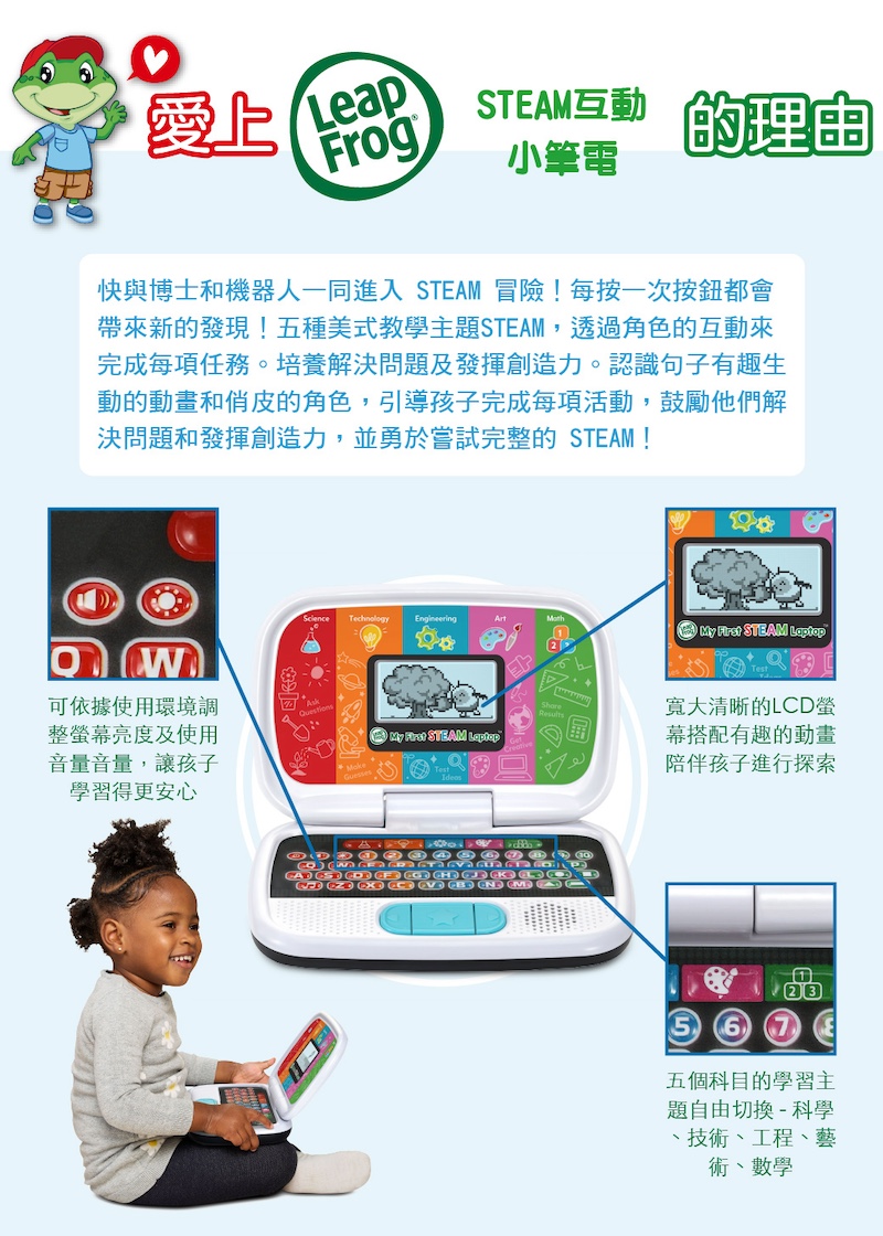 美式 STEAM 教學理念為核心,結合五大學習主題,透過角色引導與按鍵互動,引領孩子完成任務挑戰,在遊戲過程中培養問題解決能力、邏輯思考與創造力