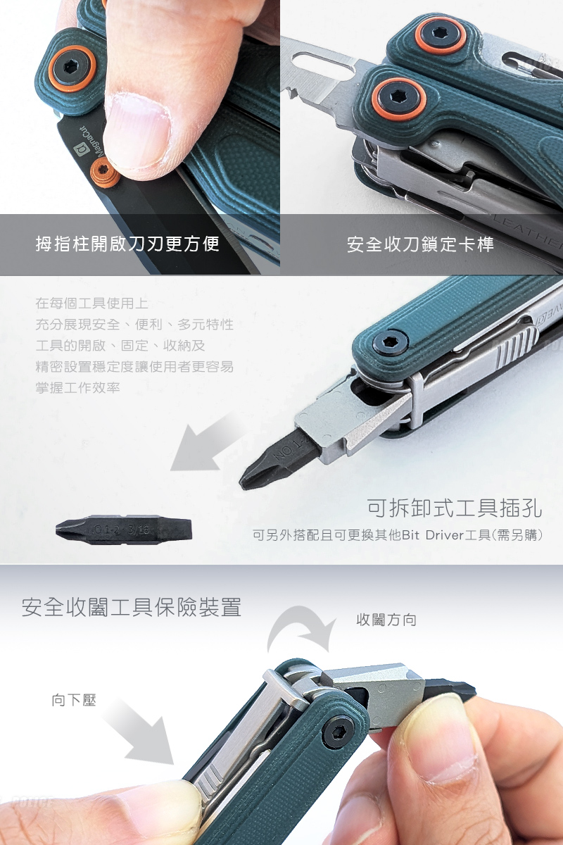 特色:》拇指柱,易於主刀快速開啟》全工具皆可鎖定(鉗頭除外)》外部鎖定功能》Bit套件相容性(需另購)》可拆式背夾(需另購)》美國製造※ 【 原廠出貨時已無附任何相關配件,如收納套與 Bit 套件組、需另購 】 ※