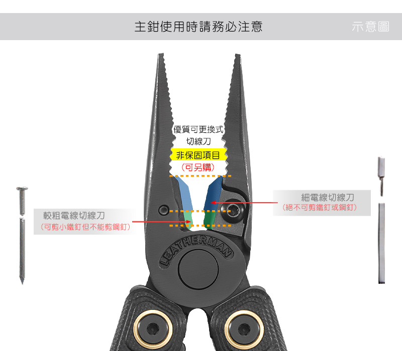※ 使 用 注 意 事 項 ※》請特別注意:本工具鉗會導電,絕對不能碰任何有電,電線、機器、物品等。》未滿18歲 兒童及少年,請勿購買刀械。》每次使用只能使用單一工具。