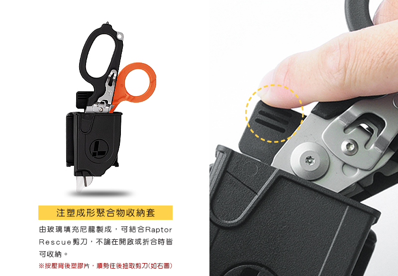 ※本產品說明,僅供參考,請勿作為正式採購招標規格,如有需要,請來電本公司洽詢相關業務人員。※以下原廠提供參考數據。品名:LEATHERMAN RAPTOR® RESCUE 多功能工具剪型號:#832170 (黑橘柄)剪刀刃長(±10%):1.9 in | 4.8 cm收闔長(±10%):5 in | 12.7 cm重量(±10%):160g(不含注塑成型聚合物收納套)功能:》420HC不鏽鋼剪刀》帶子切割器》尺(5cm)》氧氣罐扳手》軟金屬戒指切割器(例:純金或純銀戒指)》碳化鎢玻璃擊碎器特點:》不鏽鋼》25年保固》可更換的口袋夾》玻璃填充尼龍握柄》繫繩孔》MOLLE兼容的注塑成型聚合物收納套※未滿18歲 兒童及少年,請勿購買刀械。