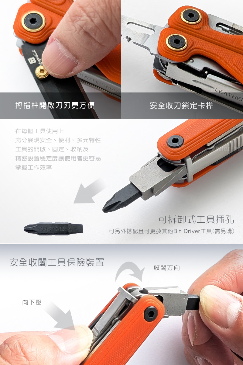 特色:》拇指柱,易於主刀快速開啟》全工具皆可鎖定(鉗頭除外)》外部鎖定功能》Bit套件相容性(需另購)》可拆式背夾(需另購)》美國製造