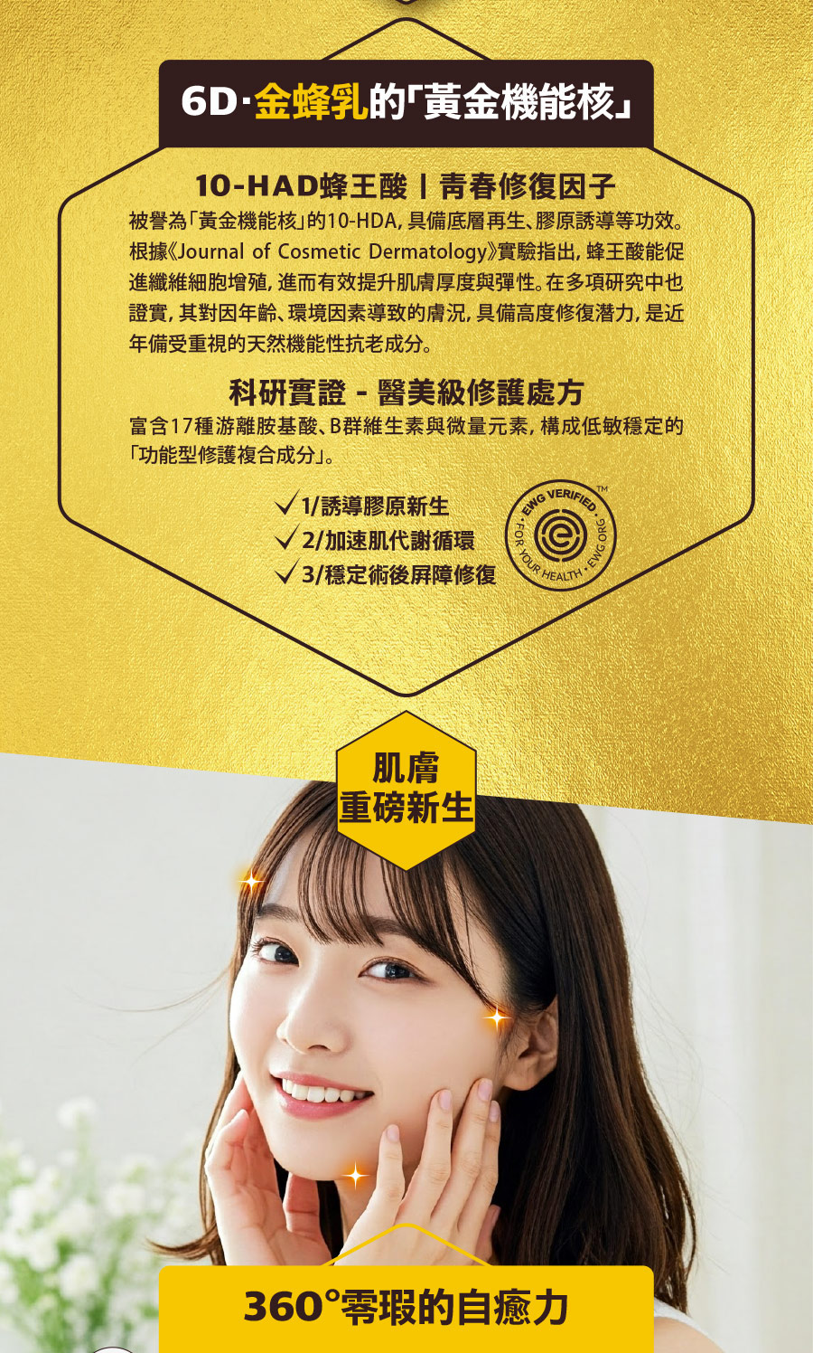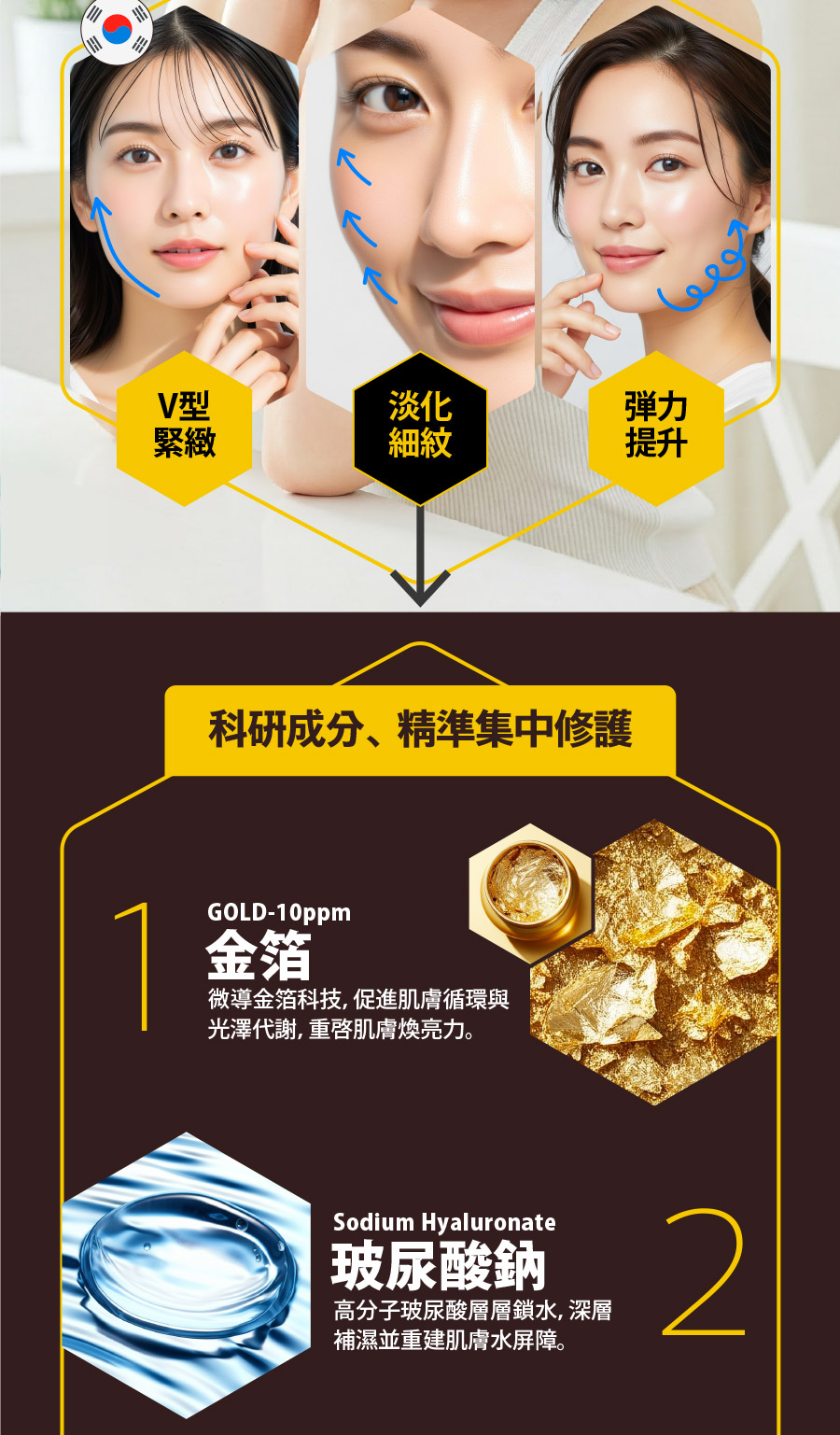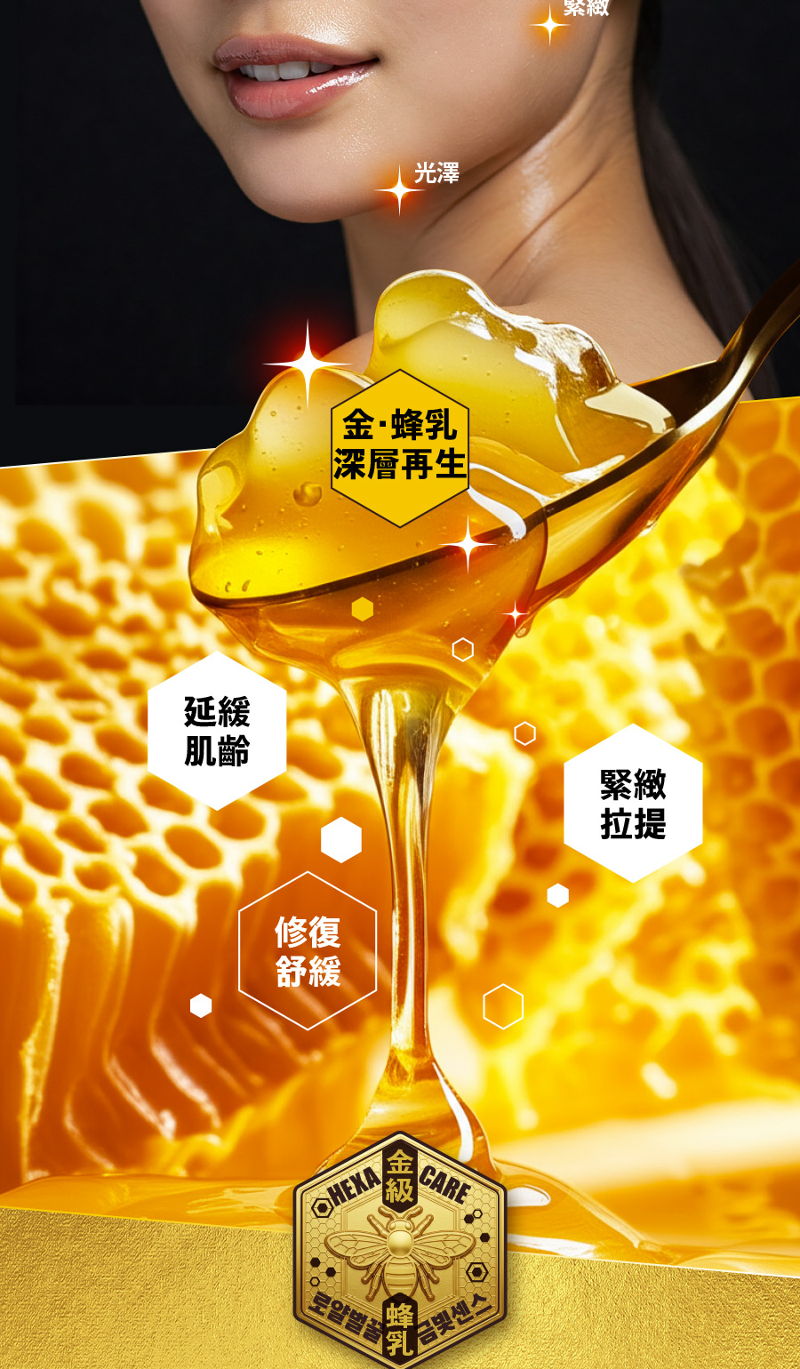 成份:金蜂王乳、金箔、玻尿酸、β葡聚醣、六胜肽、積雪草、維生素B5...等,詳細請見外包裝英文全成份列表。