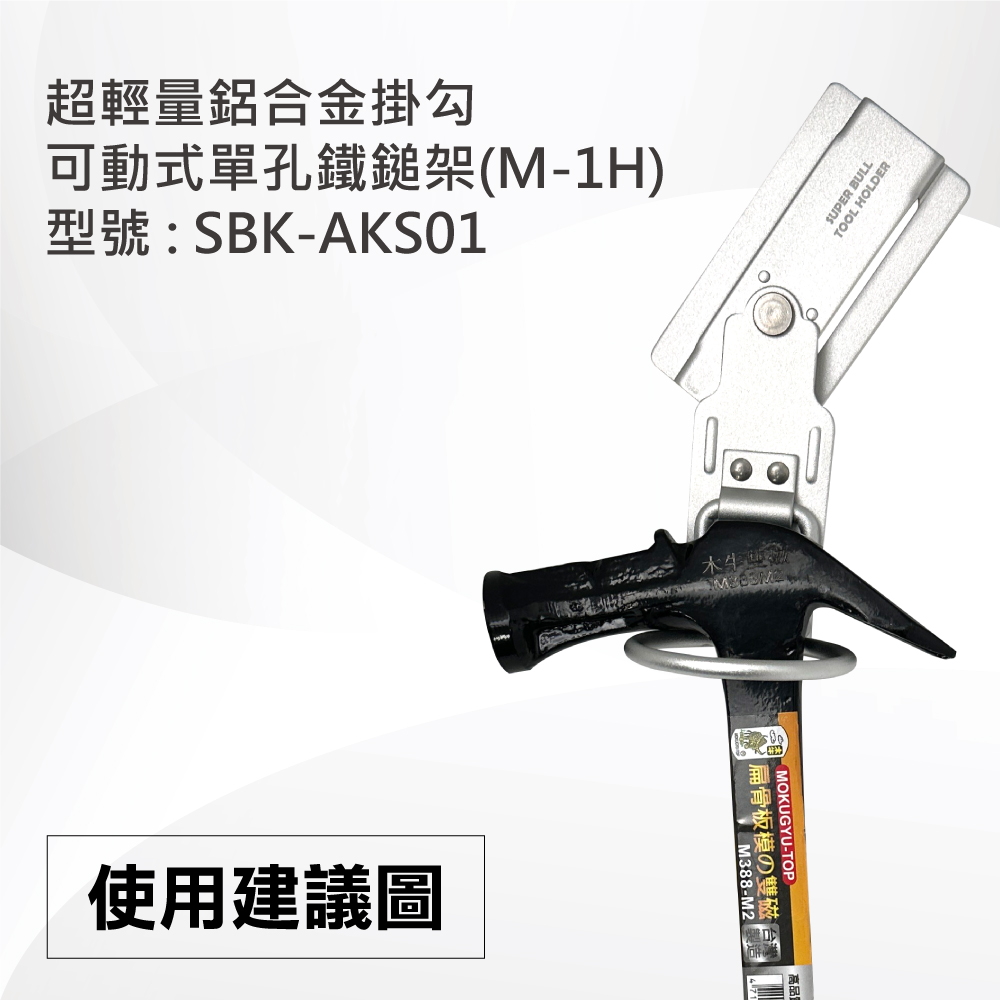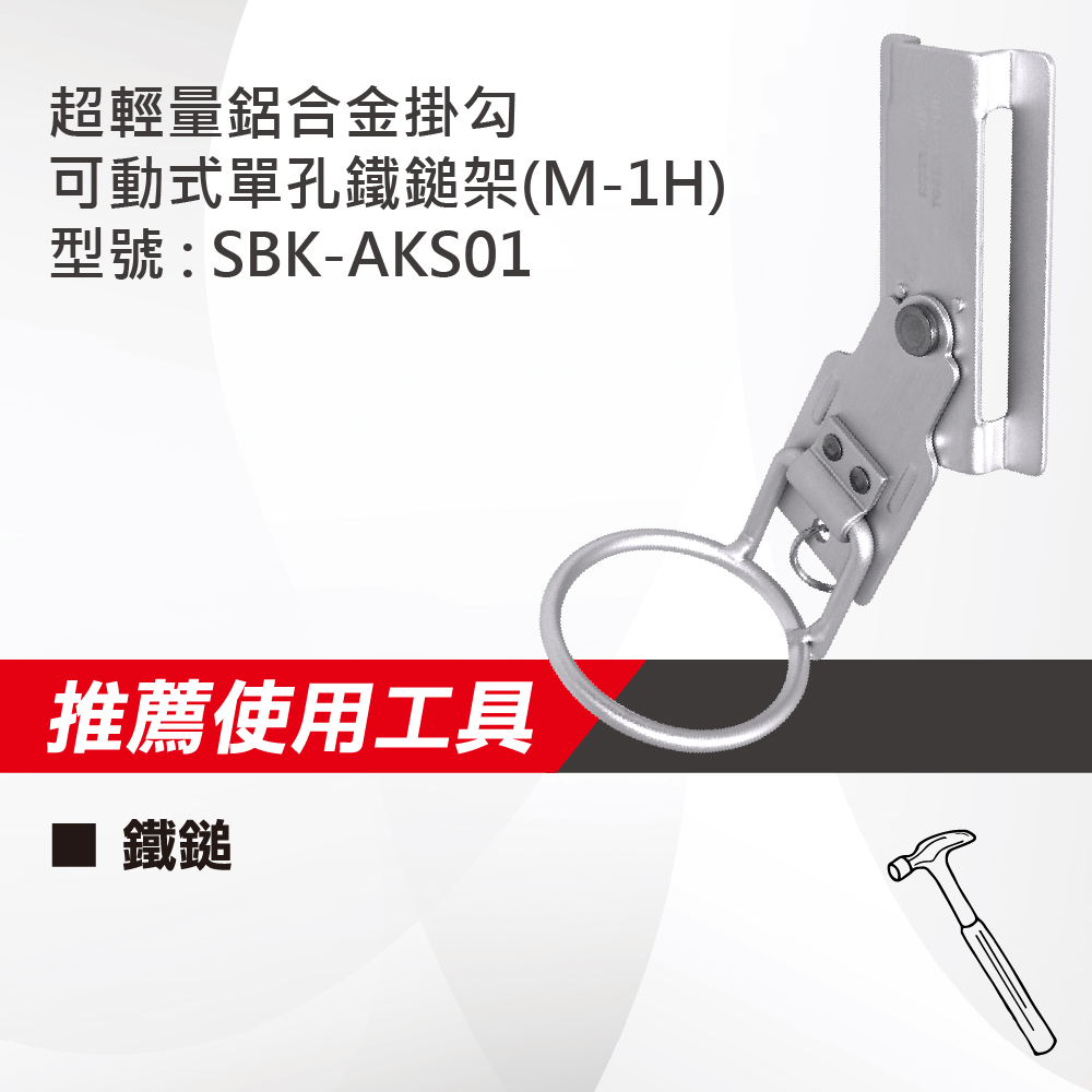 名稱 : 超輕量鋁合金掛勾-可動式單孔鐵鎚架(M-1H)型號 : SBK-AKS01重量 : 54g推薦使用工具 : 鐵鎚