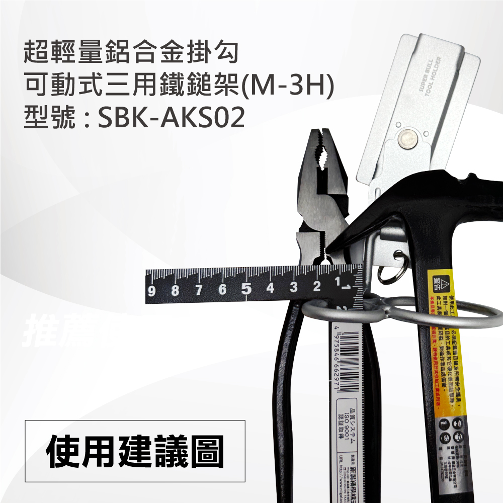 名稱 : 超輕量鋁合金掛勾-可動式三用鐵鎚架(M-3H)型號 : SBK-AKS02重量 : 64g推薦使用工具 : 鐵鎚、板模起子、木工尺、撬棒