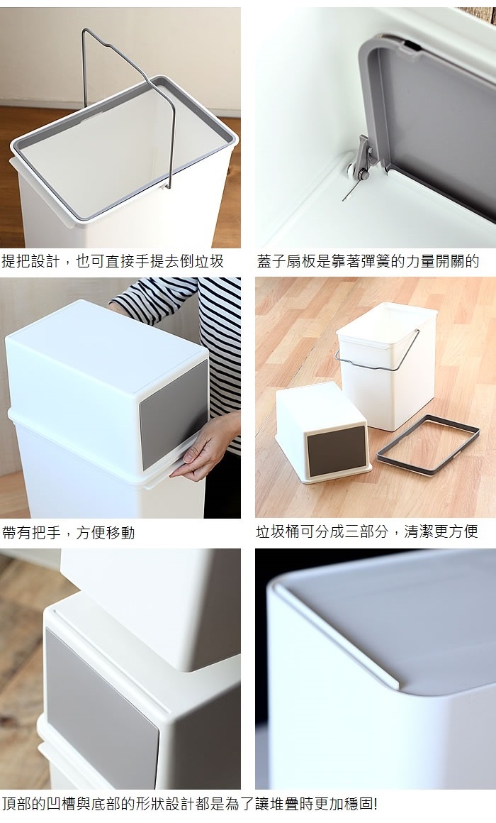 內置緩衝功能,減少蓋子開啟和關閉時的聲音同系列商品可上下堆疊使用,分類垃圾超方便附有金屬手柄,提取搬運更輕鬆本體內側黑色環狀固定器,安裝垃圾袋好簡單可愛造型,增添家內氣氛商品規格