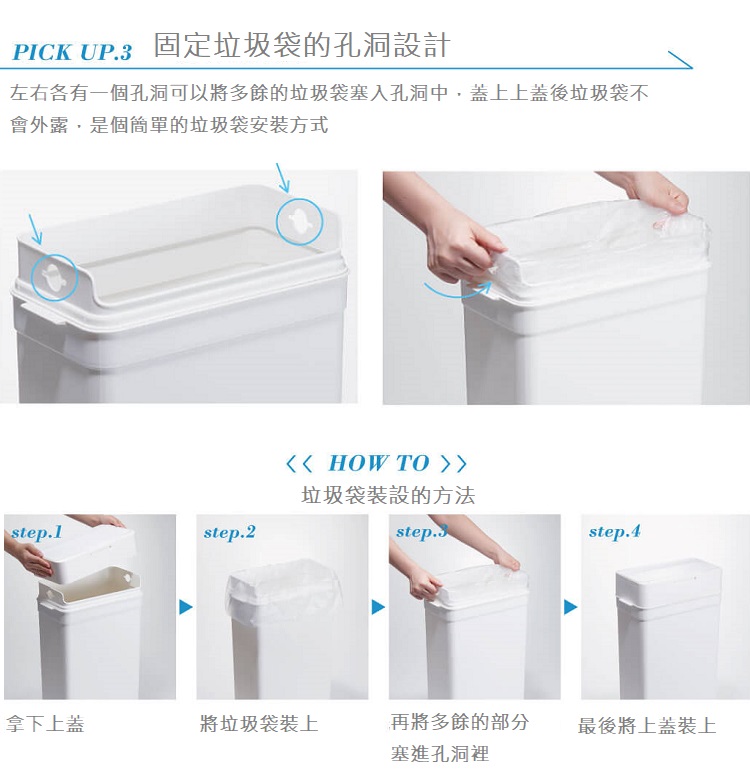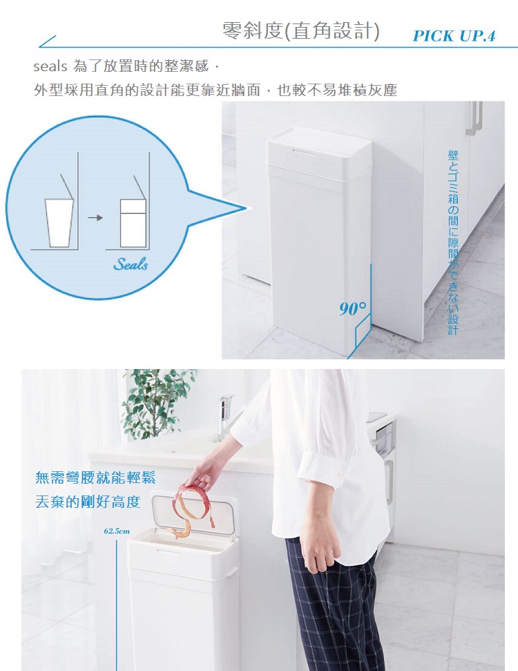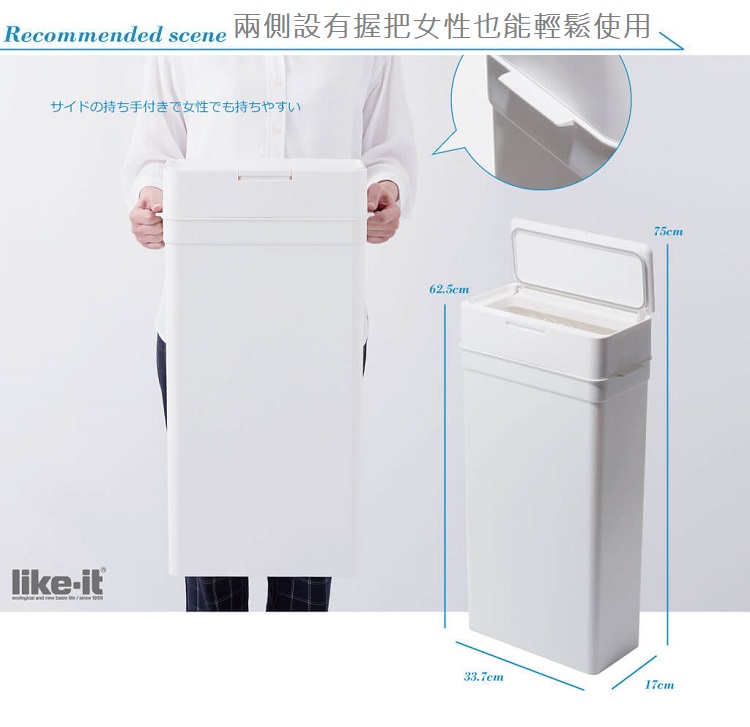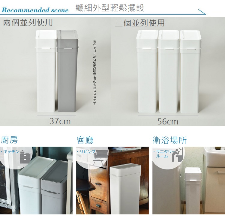 單手就能打開的one touch模式設有橡膠邊條的密封設計,垃圾味道不外流纖細外型,能輕鬆並排擺設做分類再加上外型時尚俐落,90度直角設計讓你可以更貼近牆面簡約外型,能輕鬆融入空間商品規格容量 : 25公升 尺寸 : 寬33.7× 長17 × 高62.5 cm重量 : 1.81 KG產地 : 日本材質 : 本體、蓋子、按鍵 : pp材質橡膠密封 : 硅樹脂彈簧 : 不鏽鋼