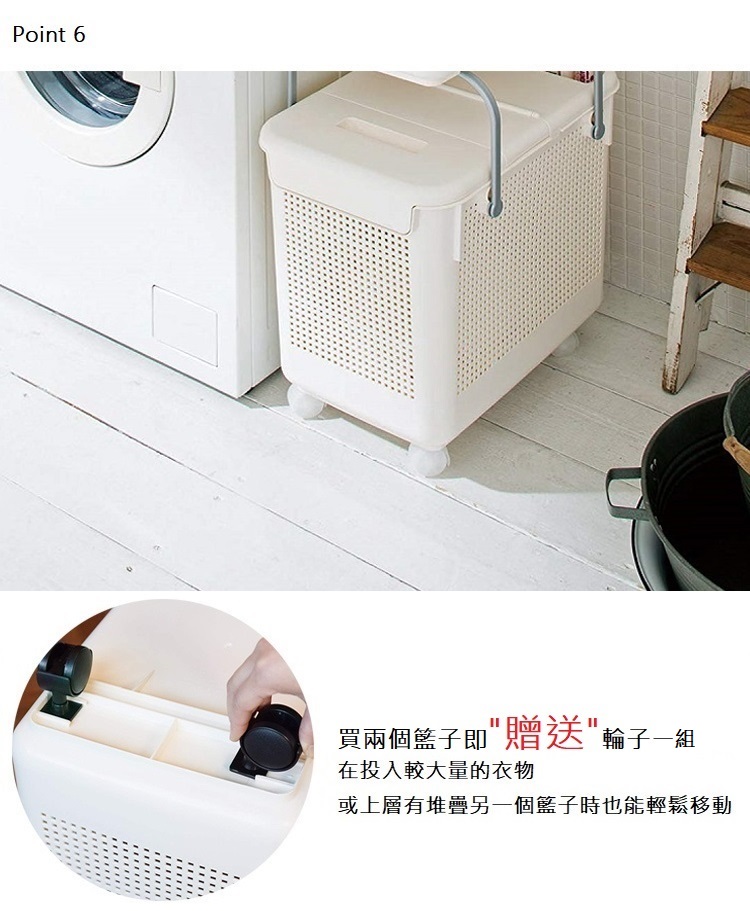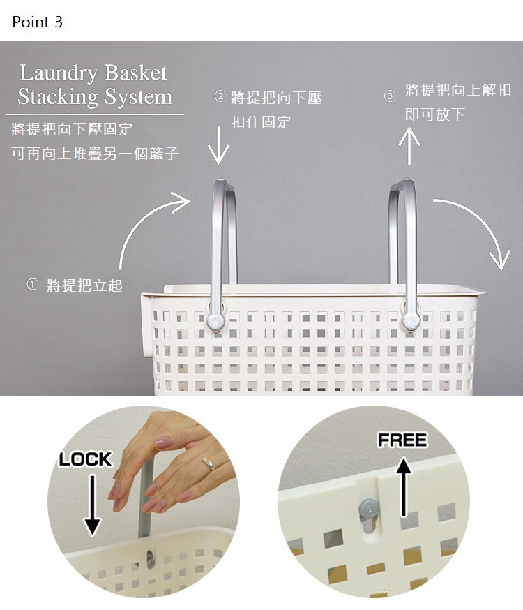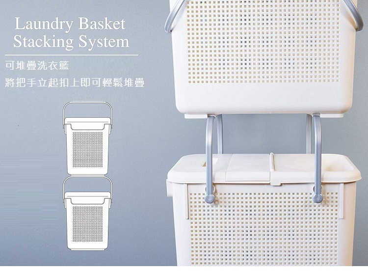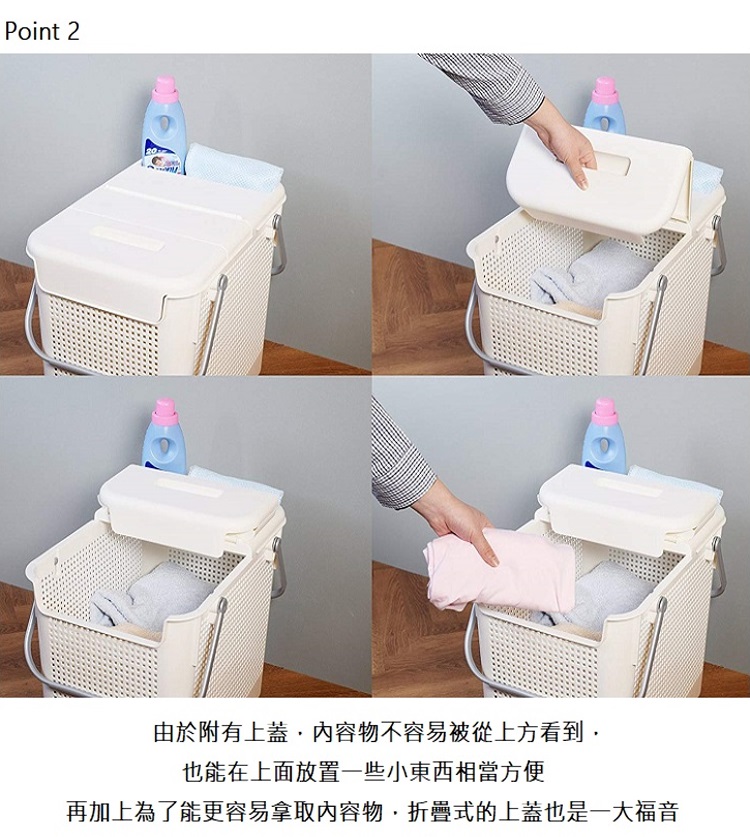 *此商品為【單個】販售*外觀細格紋設計,不但能夠遮蔽內容物,也能確保空氣流通此款附有能折疊的上蓋,不但能在上方放置小東西,拿取內容物也輕鬆提把立起扣下即可向上堆疊同商品或另外無蓋款籃子,更節省空間無論是當洗衣籃或收納籃都方便