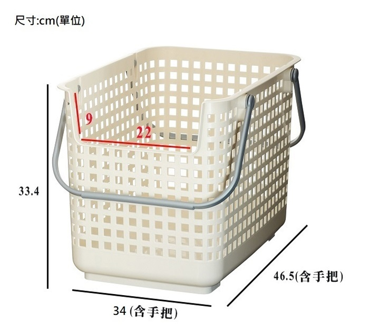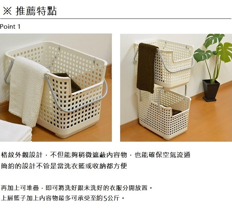 *此商品為【單個】販售*外觀格紋設計,不但能夠遮蔽內容物,也能確保空氣流通此款正面設計較低,即使上方有做堆疊拿取內容物也輕鬆提把立起扣下即可向上堆疊同商品或另外有蓋款籃子,更節省空間無倫是當洗衣籃或收納籃都方便商品規格尺寸 : 約寬34*長46.5*33.4高cm重量 : 0.9公斤材質 : 聚丙烯原產地 : 日本堆疊時提把耐重 : 最多5kg