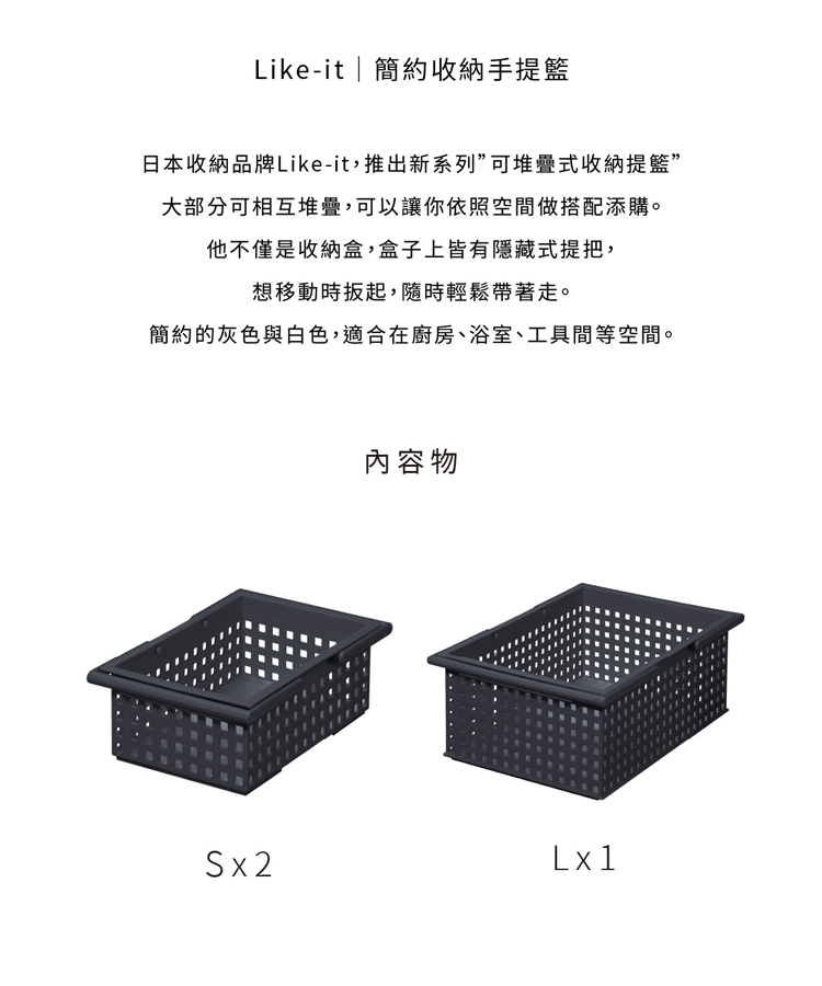 【 此賣場為 2個S+1個L 三入組 】好收納 可手提 輕巧 可堆疊您絕對不能錯過的日系簡約美型 提籃式桌面收納籃SS、S、M、L 四種此尺寸 隨意搭配使用同樣高度排一起還可當分類格使用放在衣櫃內也可以收納 襪子、內衣、內褲 等小物擁有手提把,提著就可以任意移動,因此在野外露營、野餐也都非常便利商品規格L 尺寸:(約)寬度364 x深度250 x高度140mm (提起手柄:255mm)L 重量:530±3gS 尺寸:(約)寬度268 x深度170 x高度92mm (提起手柄:183mm)S 重量:265±3g顏色:深灰色、白色材質:聚丙烯製造地:日本