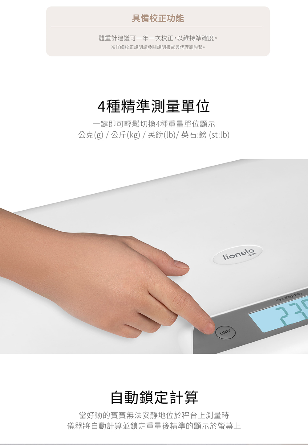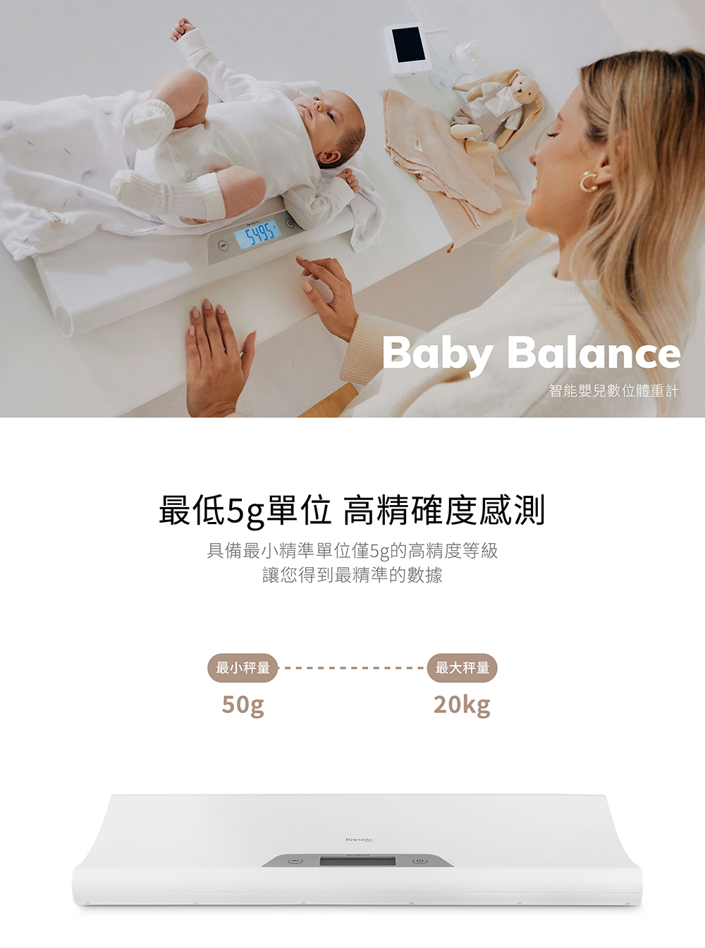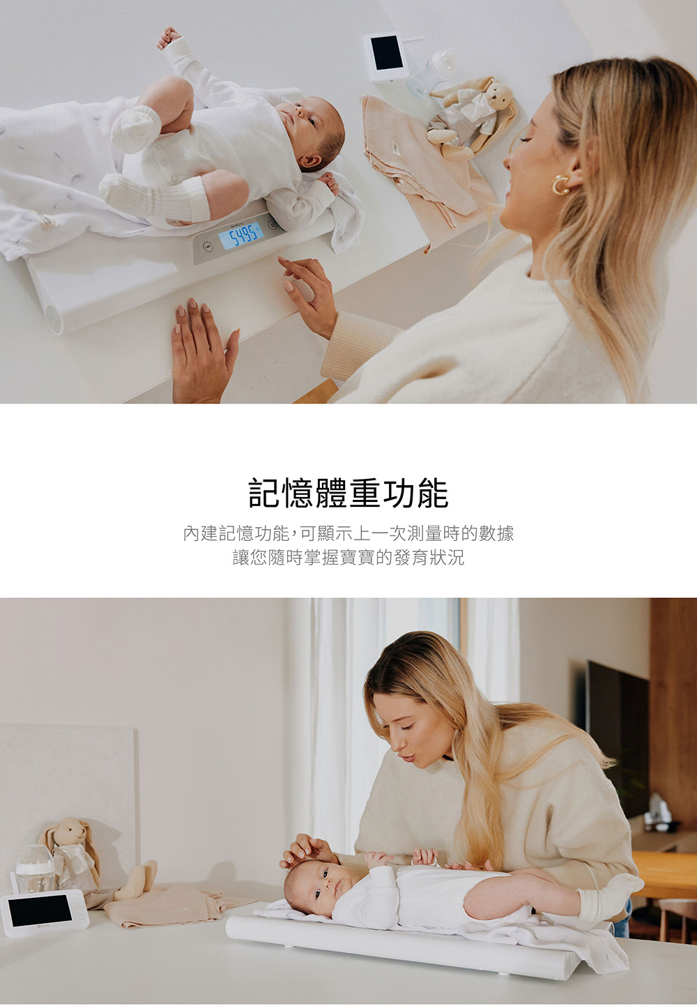 專為新生兒設計,無論是日常紀錄,還是哺乳寶寶的體重監控,都能協助爸媽更安心、科學化育兒。讓您在家中也能輕鬆掌握體重變化,搭載高精度感測器與數位顯示螢幕,即時顯示寶寶體重,即使每天微小的變化也能清楚掌握。秤面加寬加長、防滑設計,寶寶躺著、坐著都舒適穩固不易滑動。