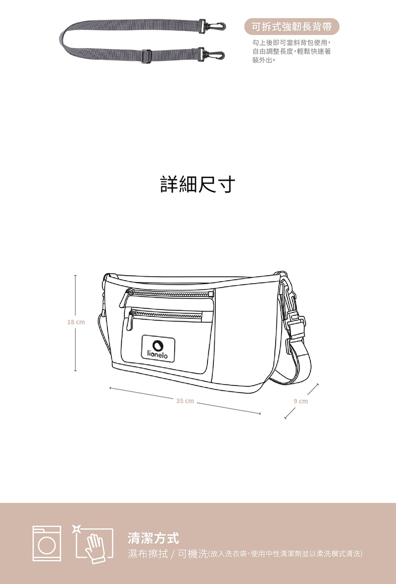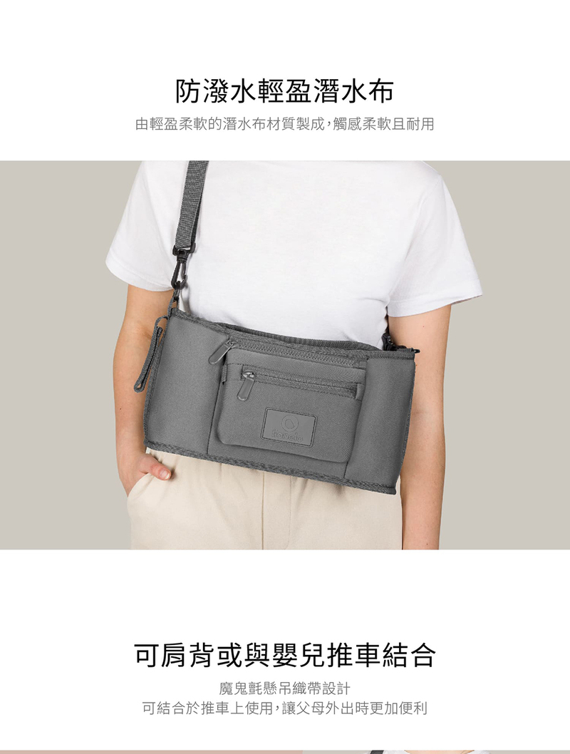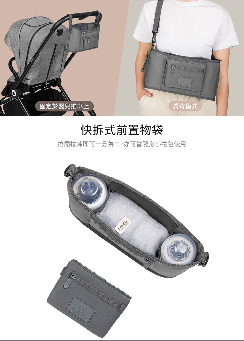 可肩背或與嬰兒推車結合/寬口分區收納/快拆式前置物袋 可當零錢包使用