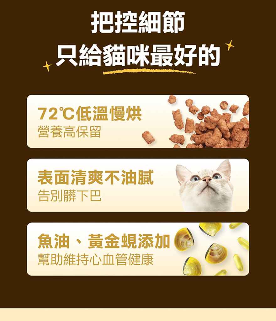 竹筴魚、雞胸肉、雞腿肉、雞肝、黃金蜆、桑葚葉、洋車前子膳食纖維、磷酸鈣、碳酸鈣、酵母萃取物、牛磺酸、維生素B群、維生素E、魚油、綜合礦物質