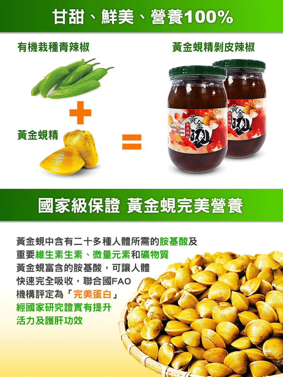 辣椒、醬汁(水、糖、素蠔油、壺底油)、黃金蜆萃取物、麥芽糊精、酵母精粉(酵母、食鹽、麥芽糊精)黃金蜆粉(蜆精液、麥芽糊精、葡萄糖、異麥牙寡糖粉)、鹽、香菇精粉(澱粉糖漿、香菇、水解醬油、鹽、焦糖色素、5`-鳥嘌呤核苷磷酸二鈉)、綜合疏果粉等