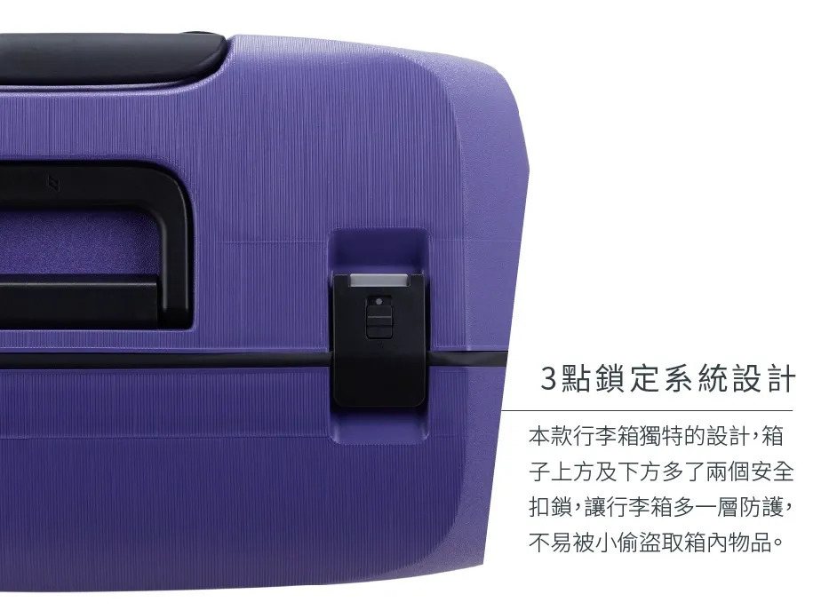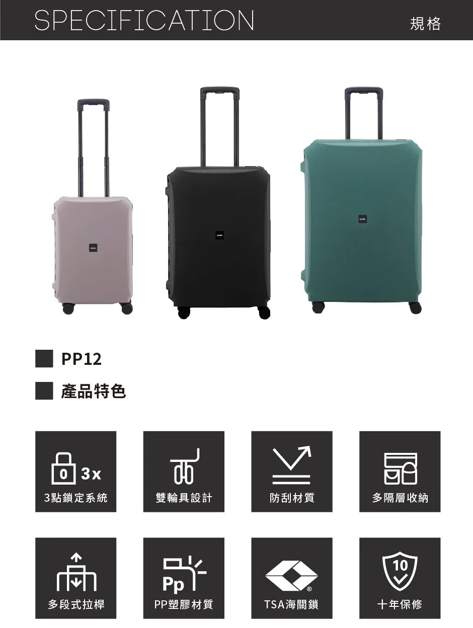 大容量設計,適合7天以上長途旅行或大量收納需求。採用高韌性PP材質搭配鋁框結構,具備優異抗壓與耐衝擊性能,即使滿載也穩定不變形。三點式鎖扣設計提升安全防護,搭配靜音萬向輪與人體工學拉桿,重裝也能輕鬆推行。內部大空間配置,收納更有效率,是長途旅行與購物型旅人的最佳選擇。