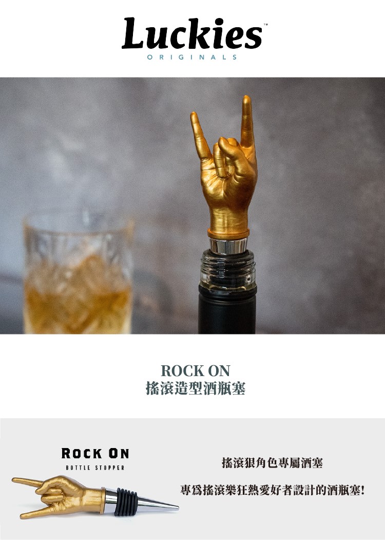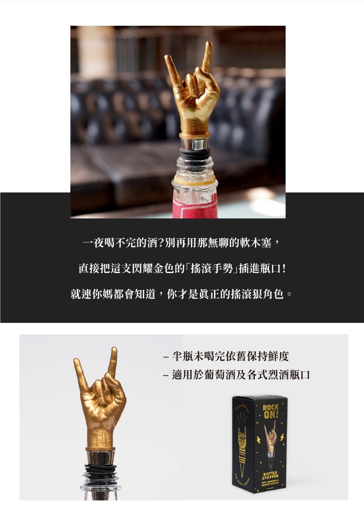 搖滾狠角色專屬酒塞一夜喝不完的酒?別再用那無聊的軟木塞,直接把這支閃耀金色的「搖滾手勢」插進瓶口!就連你媽都會知道,你才是真正的搖滾狠角色。ROCK ON!