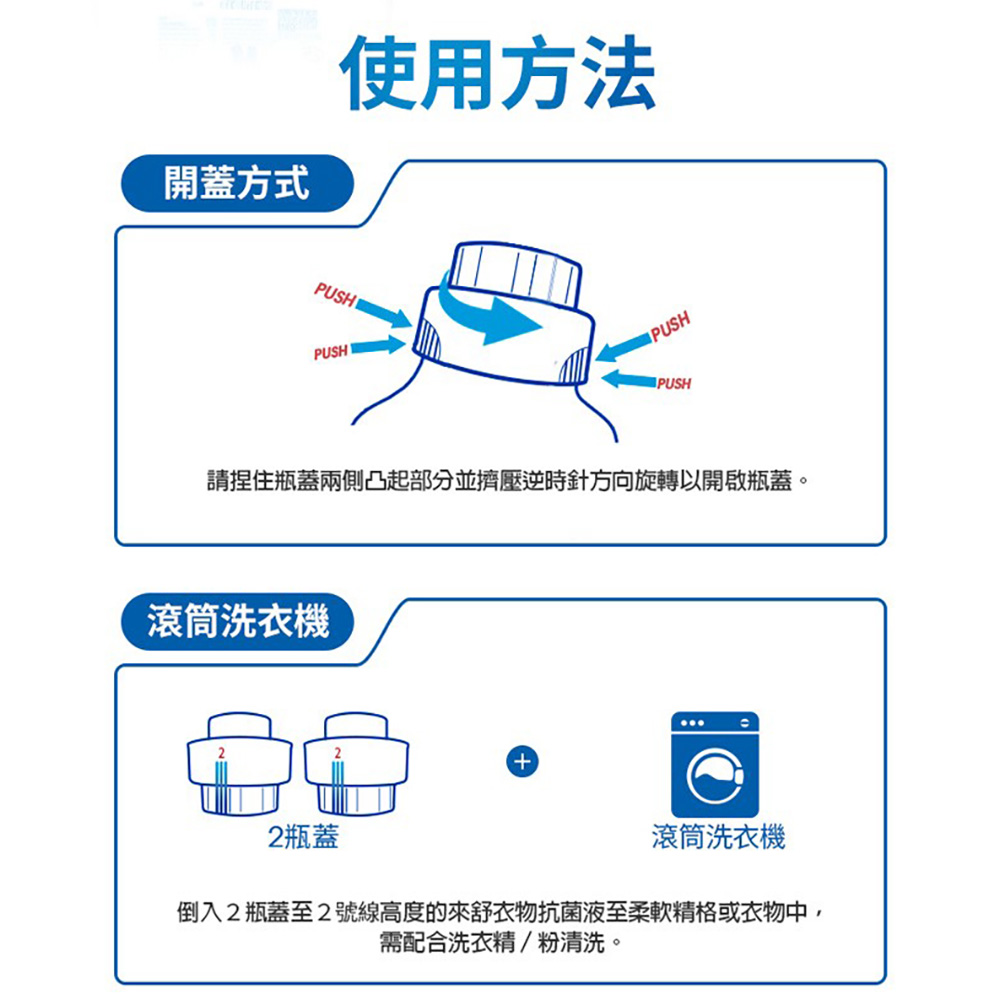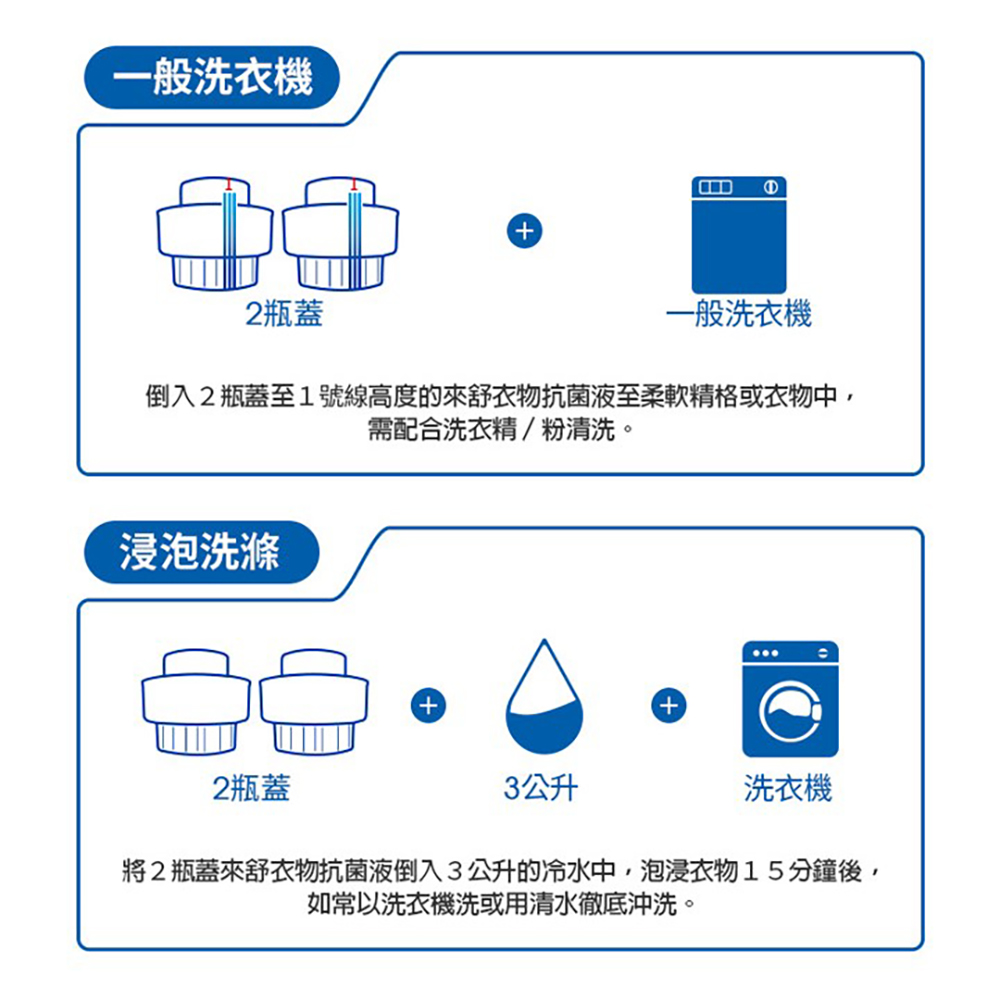 [使用方式](半瓶蓋約50ml/一瓶蓋約80ml)1.浸泡使用將2瓶蓋來舒衣物抗菌液倒入3升的冷水中,浸泡15分鐘,如常以洗衣機洗或清水徹底沖洗。2.洗衣機使用滾筒洗衣機(洗衣容量約10公斤):倒入1瓶蓋的來舒衣物抗菌液至柔軟精格或衣物中,配合洗衣精/液清洗。一般洗衣機(洗衣容量約15公斤):倒入2瓶蓋的來舒衣物抗菌液至柔軟精格或衣物中,配合洗衣精/液清洗。※請勿將來舒衣物抗菌液添加至洗衣劑格與洗衣精/液混合。
