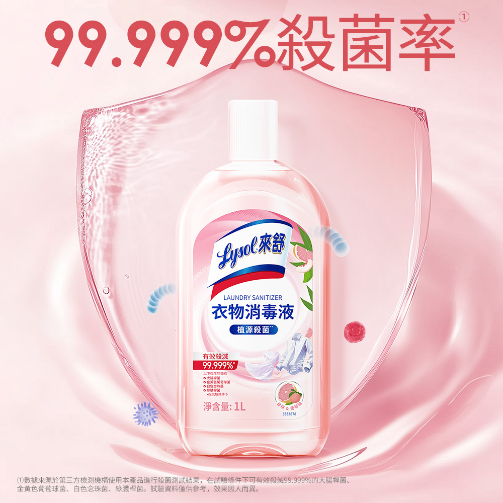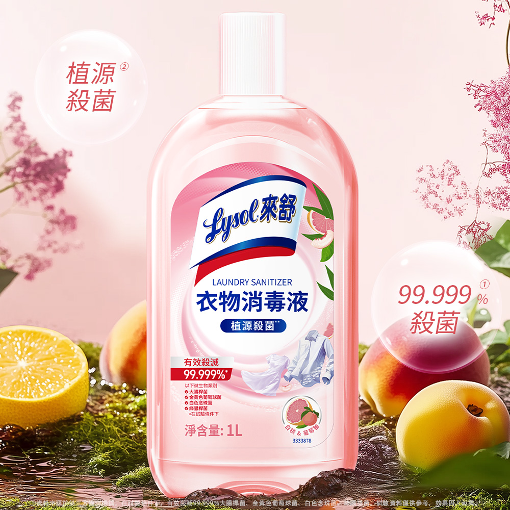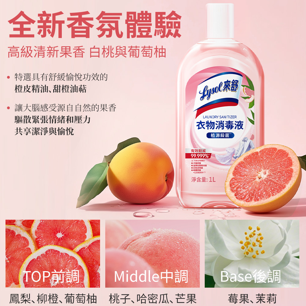 Lysol來舒 衣物消毒液-白桃&葡萄柚 (1Lx3入組) 衣物消毒/內衣褲清潔/環境消毒/溫和配方/清新果香