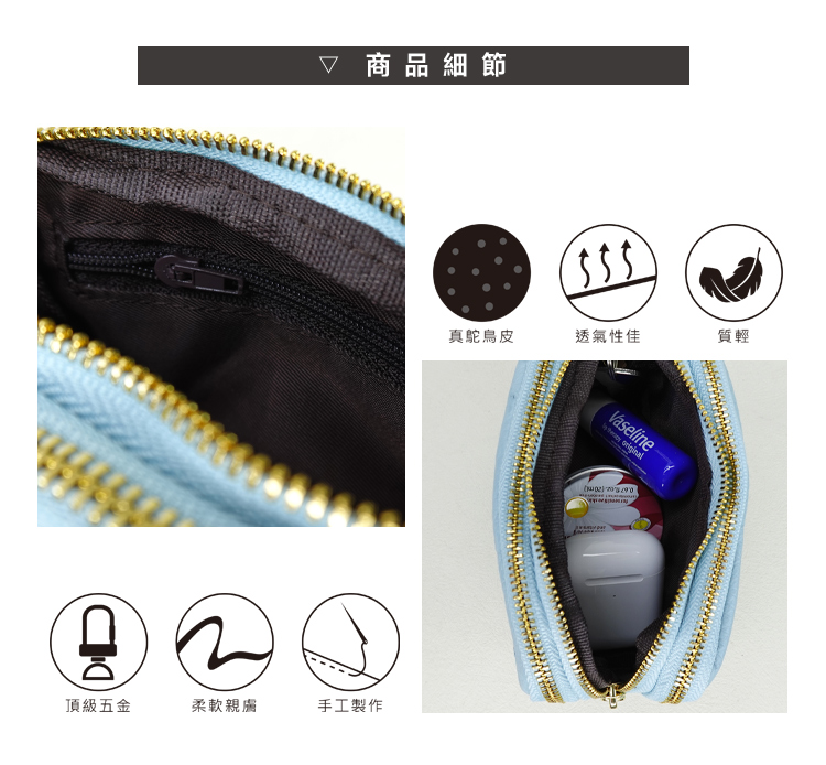 "材質:進口鴕鳥皮+五金扣環 尺寸:12.5*8*5.4cm 配件:保固卡*1 ※備註:預購商品,請以系統出貨日為主 ※其他:一年保固,新品瑕疵 ※鴕鳥皮屬於天然珍稀皮革,每一只包都有獨特的天然動物紋路 ※商品照片僅供參考 請以實品為主 ※尺寸是未裝物測量依主觀及使用略有不同,請以實物為主"