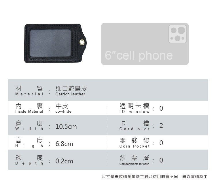 材質:進口鴕鳥皮+五金扣環尺寸:10.5*6.8 cm配件:保固卡*1※備註:預購商品,請以系統出貨日為主※其他:一年保固,新品瑕疵※鴕鳥皮屬於天然珍稀皮革,每一只包都有獨特的天然動物紋路※商品照片僅供參考 請以實品為主※尺寸是未裝物測量依主觀及使用略有不同,請以實物為主