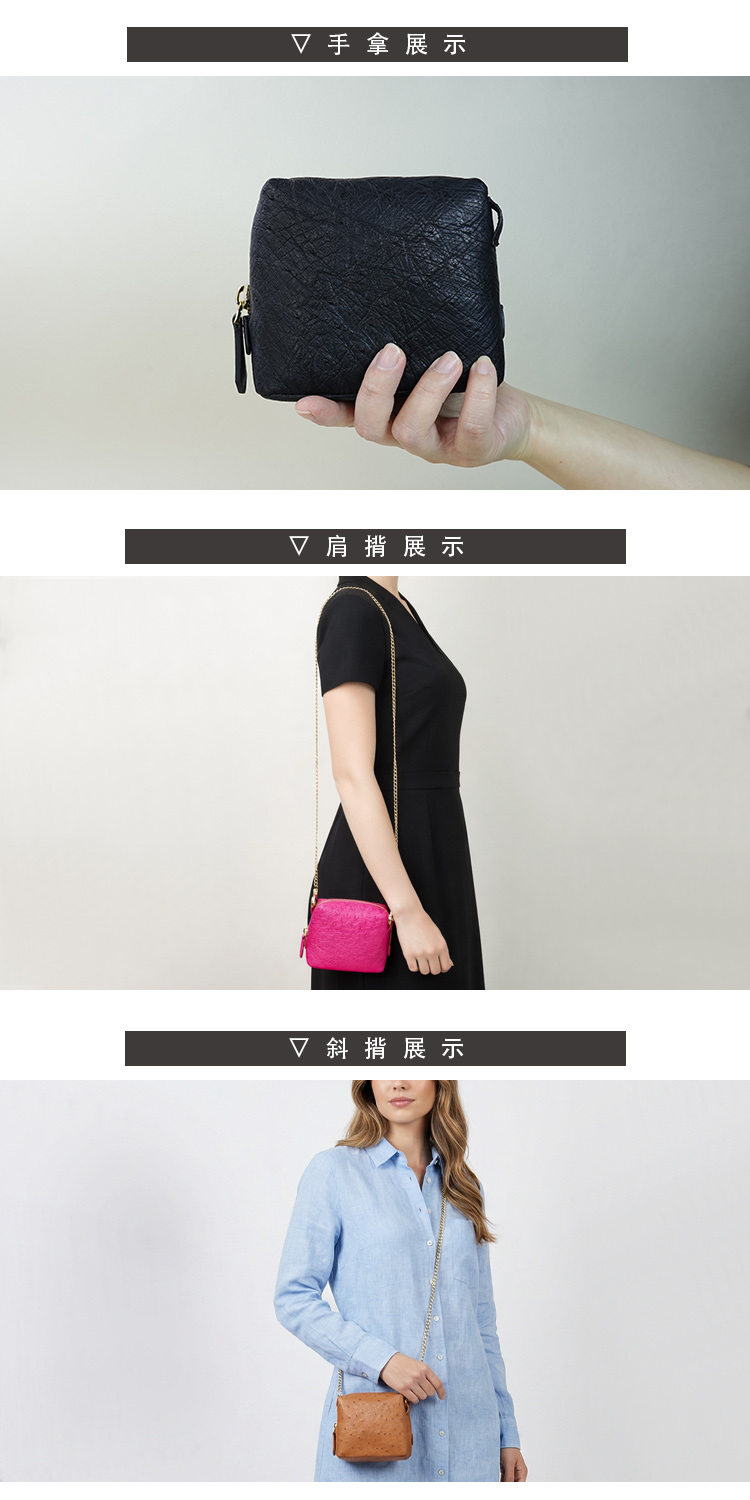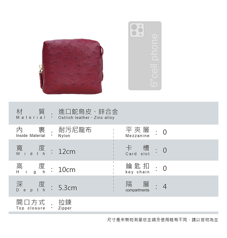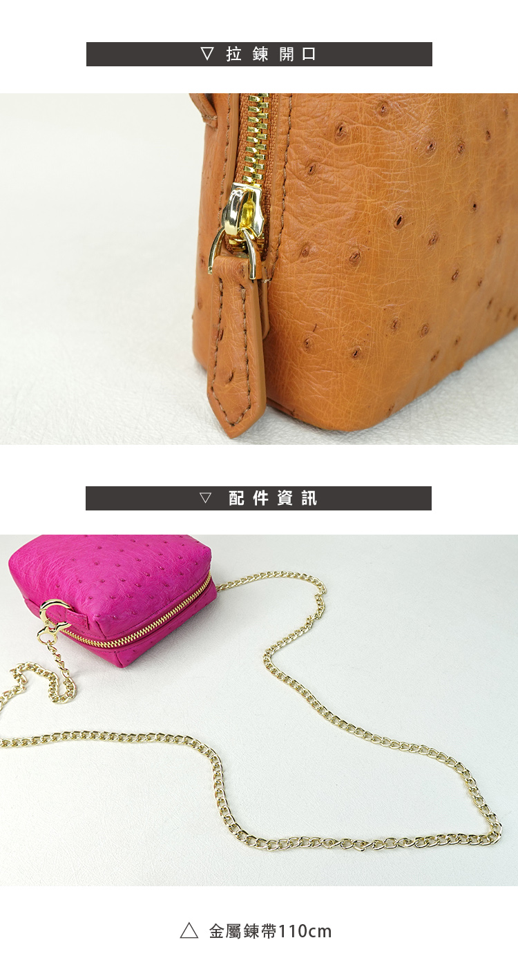 ◆材質:進口鴕鳥皮、鋅合金◆內裡:耐汙尼龍布◆尺寸:12*5.3*10cm / 鍊帶117cm◆產地:中國澳門◆保固期限:1年◆保固範圍:保固期限內,非人為損壞下,可免費維修。※鴕鳥皮/鱷魚皮屬於天然珍稀皮革,每一只包都有獨特的天然動物紋路※商品照片僅供參考 請以實品為主※尺寸是未裝物測量依主觀及使用略有不同,請以實物為主