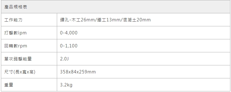 DHR202RTE(電池5.0Ah*2•充電器*1)鑽孔能力混凝土:20mm鐵材:13mm木材:26mm回轉速:0-1,100 rpm鎚擊數:0-4000 ipm長度:358mm重量:3.2kg電壓:18V