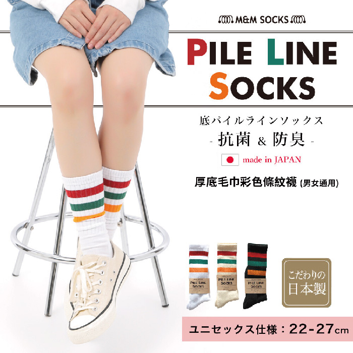 【M&M 日本製】CS10 厚底毛巾彩色條紋襪 男女通用足底〜かかと上までパイル編みでふかふかな履き心地、そしてラインのカラー・地色との組み合わせのバリエーションが豊富な底パイルラインソックスです!足底はとても良く伸びるので、22-27cmと幅広いサイズで男女履いて頂けるユニセックス仕様です。綿素材なので吸湿・保温性にも優れ、オールシーズン履いて頂けます。抗菌防臭加工の糸を使用しているので汗やムレなどのにおいも気にならない、嬉しい機能付き。底絨線襪柔軟舒適,從腳底到腳後跟都有厚底毛巾編織,條紋和底色的組合也有很多變化! 鞋底的彈性非常好,因此男女皆宜,22-27cm的尺碼範圍廣泛,男女均可穿著。棉質材料具有出色的吸濕保溫性能,四季皆宜。使用經過抗菌和除臭處理的線使其無異味,無汗水和濕氣。尺寸:22-27cm (長26cm)材質:棉、聚酯纖維、人造絲、壓克力產地:日本國際條碼:CS10-01 白色紅條紋 4580652742856CS10-03 米色紅條紋 4580652742863CS10-04 黑色紅條紋 4580652742870