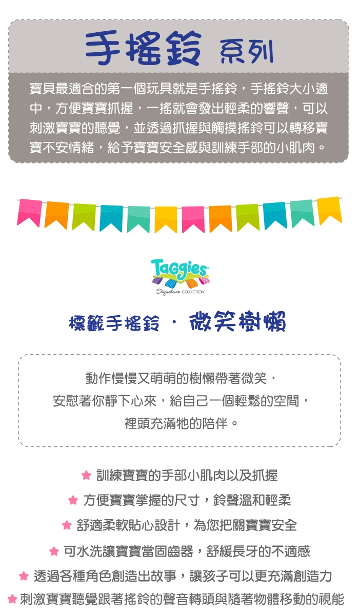 ●微笑樹懶-慵懶的肢體搭配超可愛的表情,療癒了媽媽,逗樂了寶寶,就要被融化了!●造型吸睛的可愛造型設計●安全柔軟布料,纖細柔軟不傷害寶寶柔嫩肌膚●觸感柔軟舒適●商品聲響設計,可刺激寶寶聽覺,亦適合寶寶手指動作練習。●完美適合小手的尺寸注意事項●請在大人的監督下,讓寶寶使用本產品●為避免產生窒息危險,請將包裝塑膠袋放置寶寶拿不到的地方●為安全起見,本製品如出現破損、變形請勿再使用●請勿接觸火源●此商品屬於消費性商品,如有損壞,無法維修