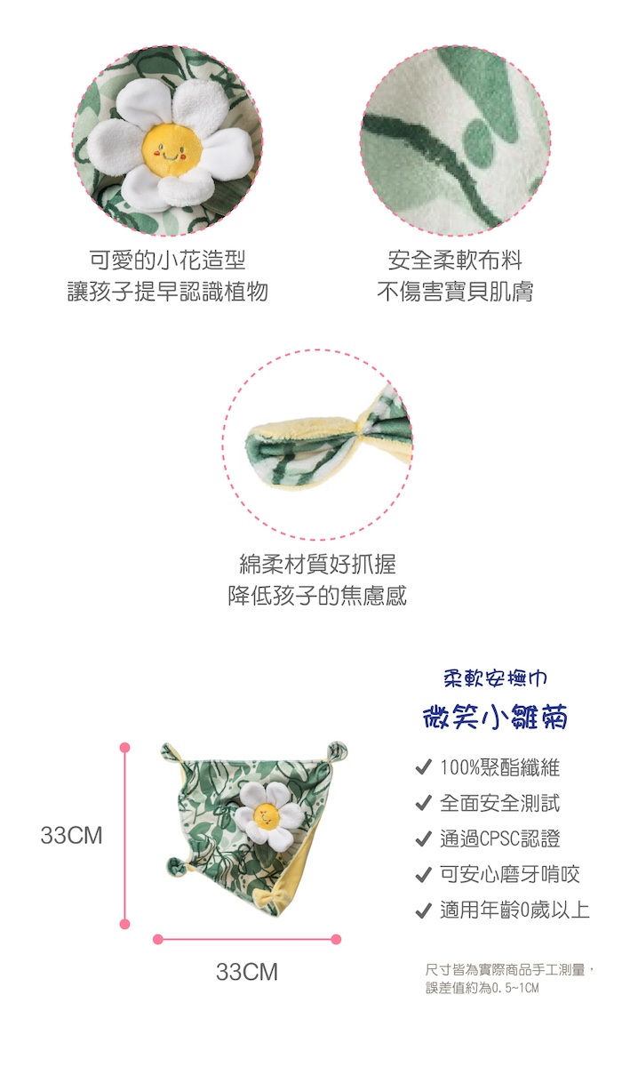 ●清新亮麗的微笑小雛菊,如同暖陽又天真充滿希望,用笑容療癒身邊每一個人。●觸感柔軟且帶給寶寶安全感,陪伴寶寶讓他勇敢自行入睡。●寶貝最愛打結的角落。●優雅配色、精緻的細節。●安全柔軟布料適合孩子抓握。●纖細柔軟不傷害寶寶柔嫩肌膚。●不同的布料刺激觸覺,有效的安撫寶寶。