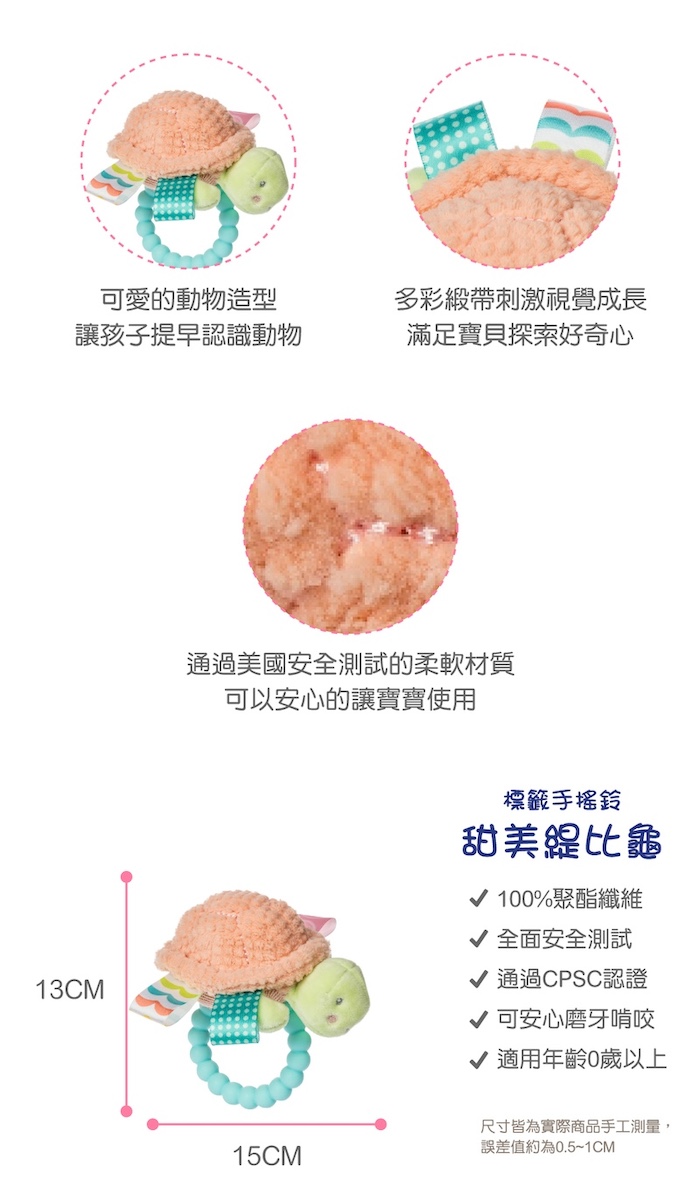 甜美緹比龜與其他小動物不同,牠總是安靜的觀察周圍的一切,對森林裡的世界充滿好奇●矽膠材質的手把可當固齒器,讓寶寶口慾期不亂放東西在嘴巴,也可舒緩口腔不適●商品聲響設計,可刺激寶寶聽覺,亦適合寶寶手指動作練習●適合小手的尺寸抓握,輕鬆訓練手部小肌肉●安全柔軟布料,不傷害寶寶柔嫩肌膚